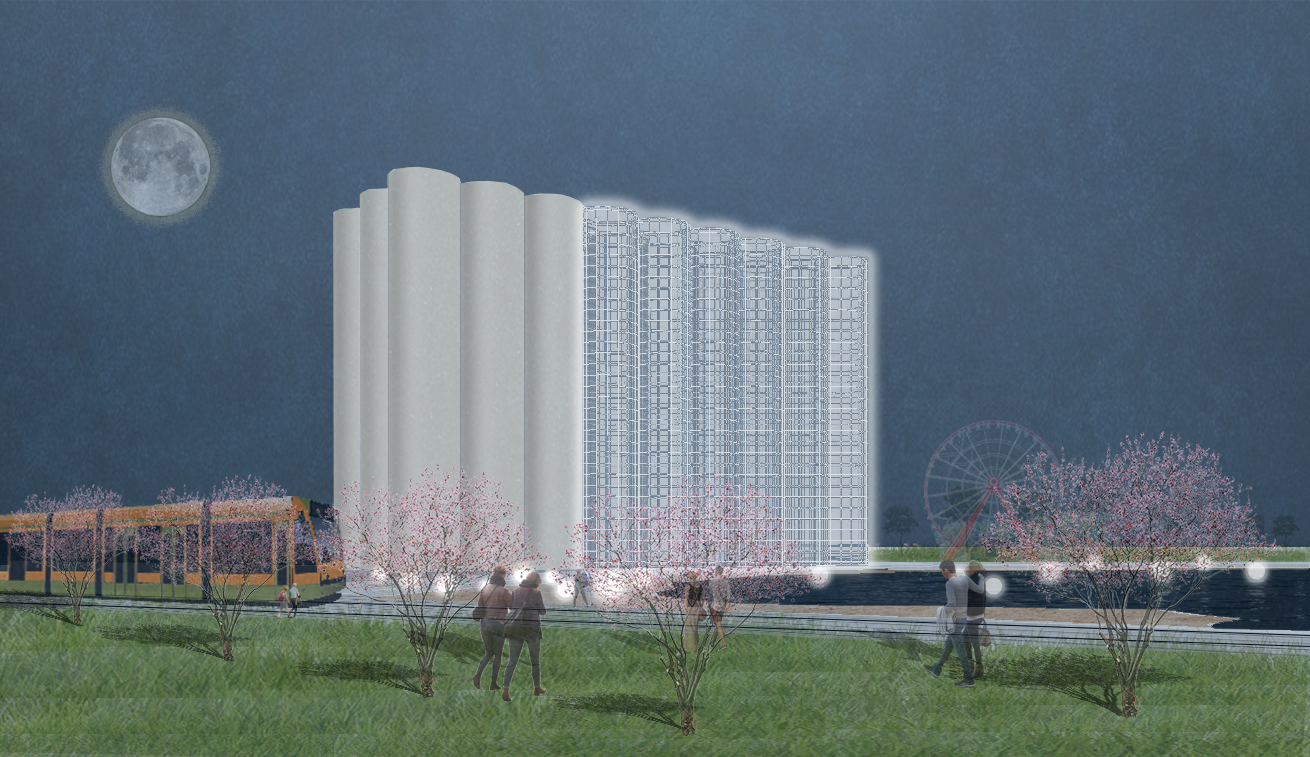render a serene urban scene at night a tall cylindrical white concrete building dominates the center glowing softly against the deep navy blue sky with a full moon adding a gentle luminescence cherry blossom trees with pink flowers line the green grassy foreground their delicate branches swaying slightly a modern tram with an orange exterior glides past on the left contrasting subtly with the scene a ferris wheel in the background casts a faint silhouette its lights dim water reflects the scene quietly enhancing the peaceful ambiance the atmosphere is calm and ethereal evoking a sense of tranquility