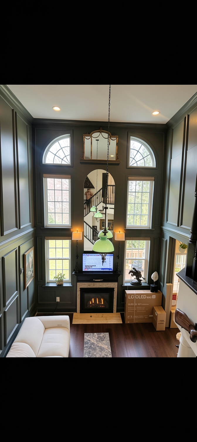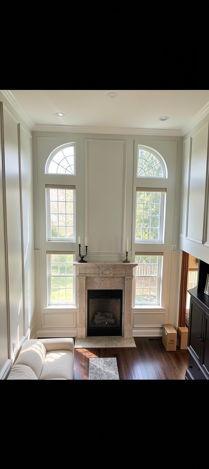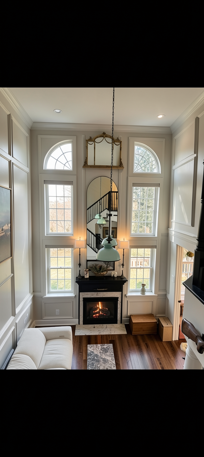 remove decor from walls add paneling lower fireplace restoration hardware remove lights remove mirrow