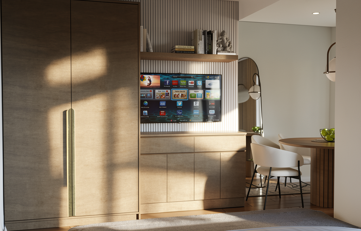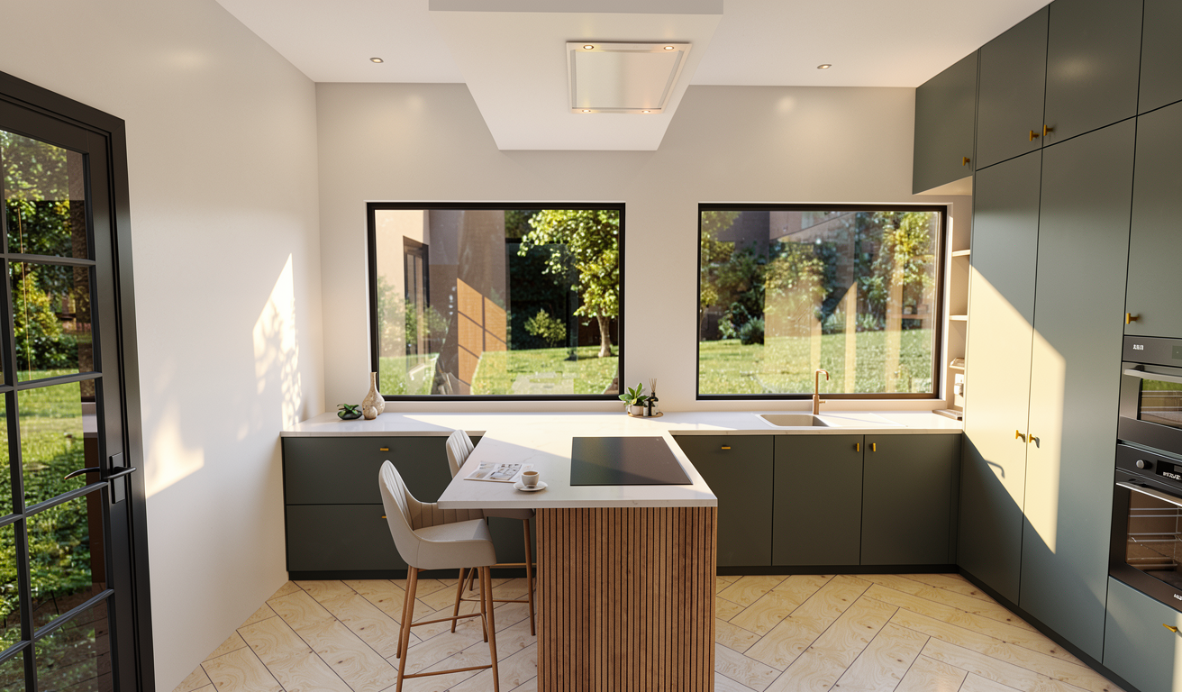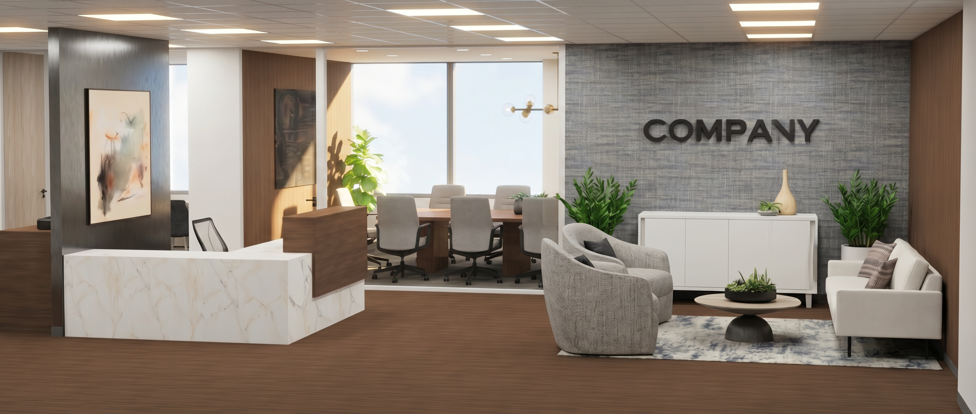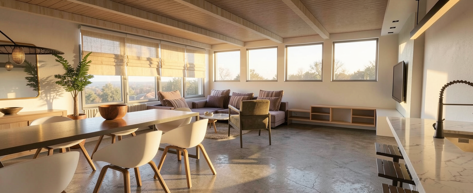 render with nice lighting on behind the chair and table plain wall into floor to ceiling mirror