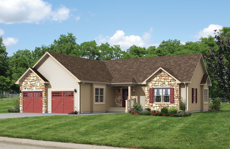 exterior shot a charming suburban house surrounded by lush greenery the house is a cozy single story featuring light beige siding with brown stone accents the roof is a rich chocolate brown the garage doors are a deep elegant maroon perfectly complementing the rustic aesthetic the front yard is vibrant with well maintained green grass with a few small colorful flower beds near the house the sky above is a clear bright blue with fluffy white clouds scattered through it creating a serene and inviting atmosphere architecture