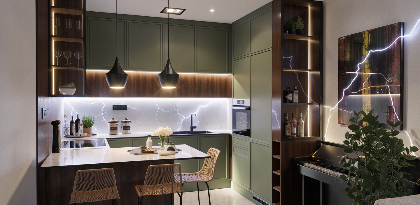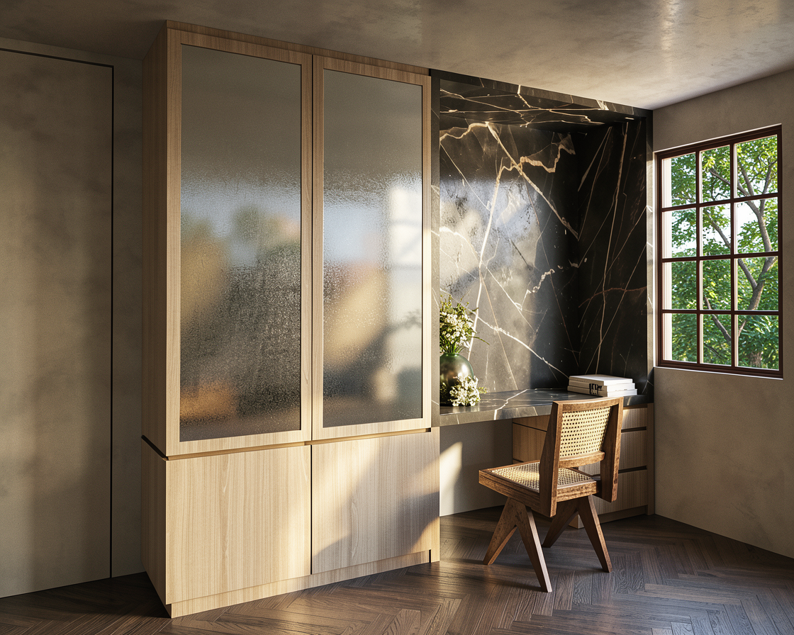 transform the provided elevation into a hyper realistic interior photograph that is indistinguishable from a real professionally shot interior design photograph this must read as a real space captured by a camera not a rendering not a visualization not architectural cg not concept art and not an illustration geometry lock non negotiable preserve the exact original geometry layout proportions ceiling details wall depths panel divisions openings doors cabinetry locations millwork dimensions built ins and circulation paths with zero architectural changes nothing may move scale simplify or be reinterpreted geometry must remain absolutely unchanged camera derivation critical derive the camera position height angle and framing strictly from the uploaded elevation eye level interior photography centered or naturally balanced composition 24 35mm interior lens feel no dramatic angles no stylized framing do not reuse or approximate camera framing from any previous image remove all drawing artifacts completely remove all linework cad edges drafting outlines diagrammatic shapes sketch artifacts nothing may appear outlined flat schematic or illustrative the elevation must be visually reinterpreted as a finished real interior photograph material realism rules wood if present smooth solid plank material extremely subtle restrained grain matte or soft satin finish only no graphic patterns no decorative striping no visual noise wood must absorb light gently never glossy or sharp fabric upholstery if present soft compression subtle seams gentle shadowing natural fabric texture no flat color blocks stone slabs if present light natural veining soft organic variation low contrast no symmetry no bold or busy patterns stone must feel heavy and grounded walls fine surface texture slight tonal variation never flat paint edge construction realism all edges corners joints and transitions must be softly broken and physically realistic no razor sharp corners no cgi perfect edges slight construction tolerances only everything must read as fabricated installed and dimensional lighting photographic behavior lighting must behave like real high end interior photography natural daylight only unless otherwise specified realistic light bounce gentle shadow falloff uneven exposure distribution subtle brightness variation across surfaces avoid studio lighting uniform illumination over clean exposure global illumination look slight softness is preferred over sharpness camera image imperfections very important introduce subtle photographic characteristics gentle lens softness micro exposure variation natural contrast roll off mild atmospheric depth primary plane sharp background slightly softer the image must feel captured not generated absolute constraints no creative interpretation no stylization no exaggeration no added or removed elements any deviation from the original elevation geometry or intent is unacceptable negative prompt always include architectural rendering 3d visualization cgi unreal engine octane vray sketchup look flat textures graphic lines outlined edges over sharpened studio lighting concept art illustration ai look plastic materials glossy wood high contrast grain perfect symmetry keep design as shown in the picture keep the design as it is in image light cabinets are white and brown cabinets are white oak keep design in the image as it is