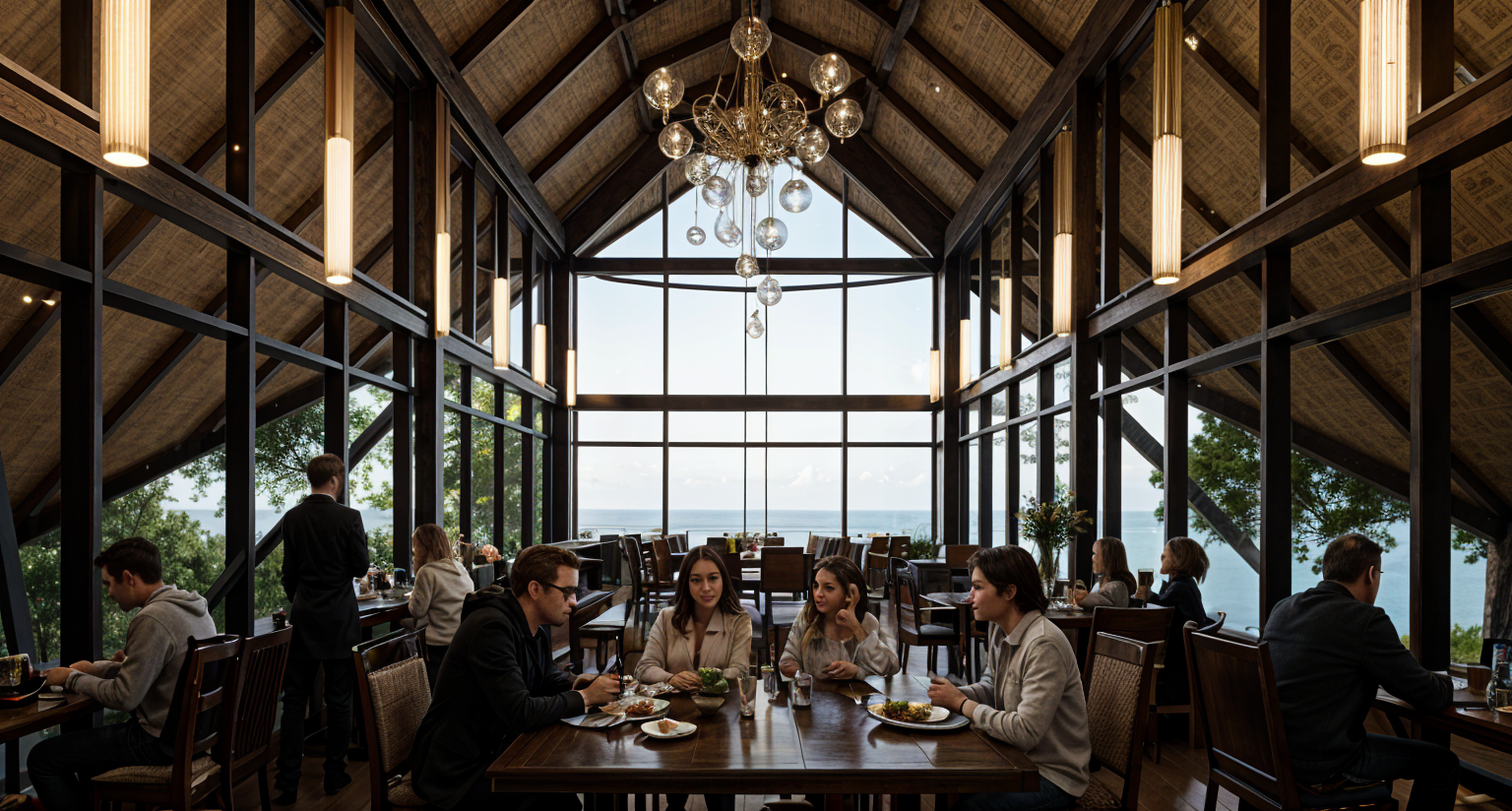 create a realistic render of the image with exact render from the reference do not change anything add people dining talking and eating in the tables dont distort the faces