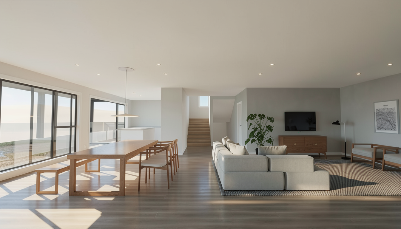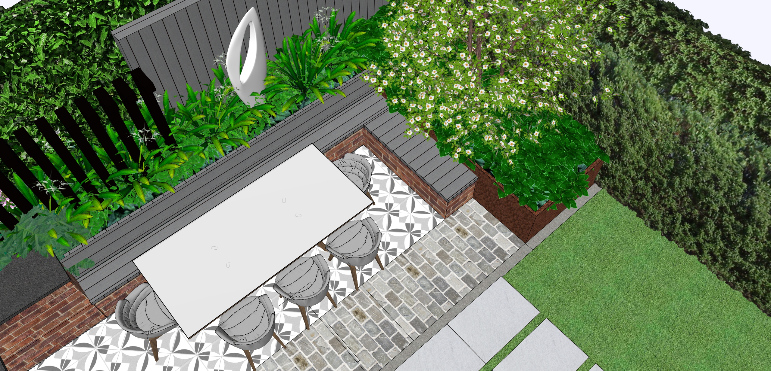 patterned porcelain paving sandstone setts dining table bespoke bench with brick base and timber bench and backrest white sculpture black steel posts grey composite fence rusty steel planter with large camelia tree full sun coming from the bottom of the image