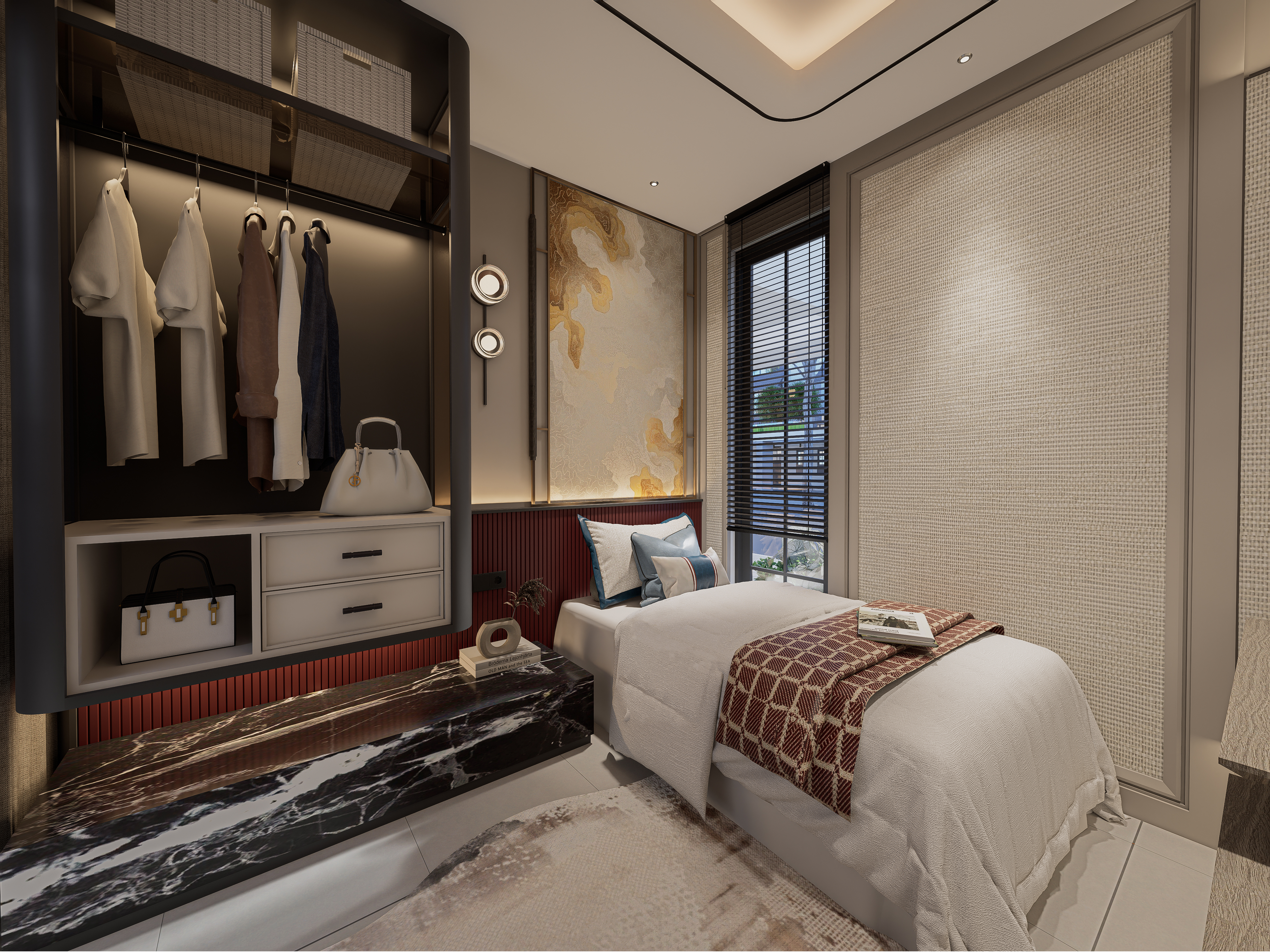 please change the color of red burgundy headbed panel with dark medium brown tone please keep the nero marquina side table just same as the render