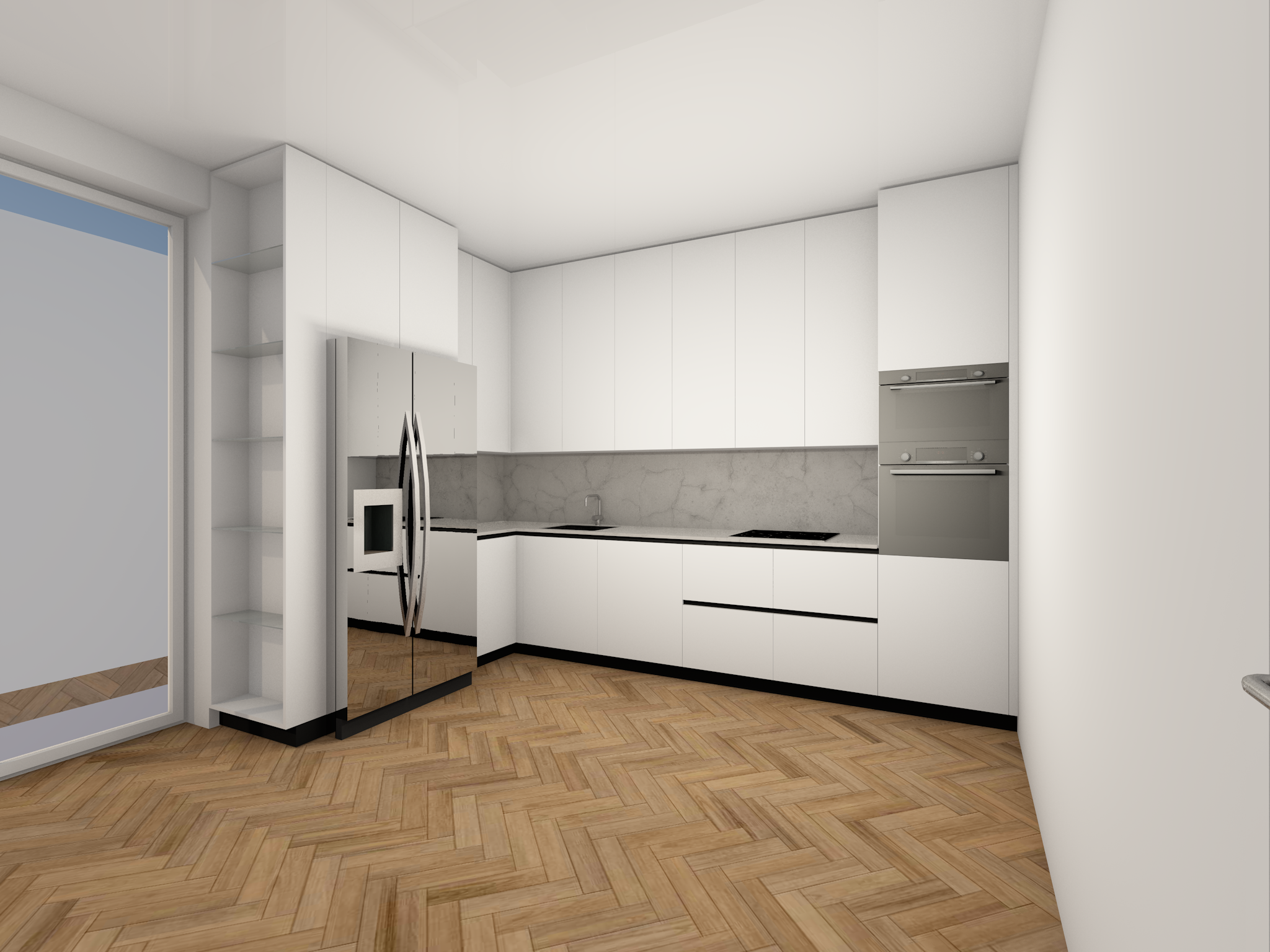 minimalist soft white kitchen add kitchen accessories fridge is stainless steel the open shelves are from glass