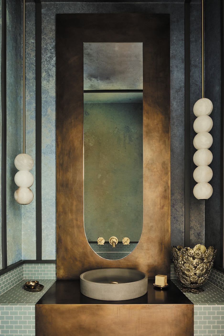 change the finishes in this image by using travertine red for the sink and the wall background