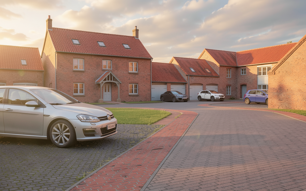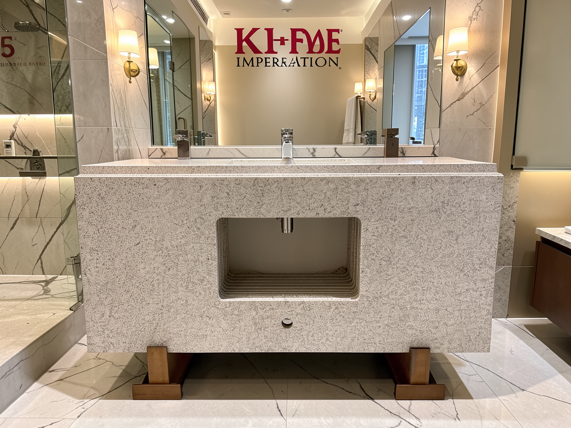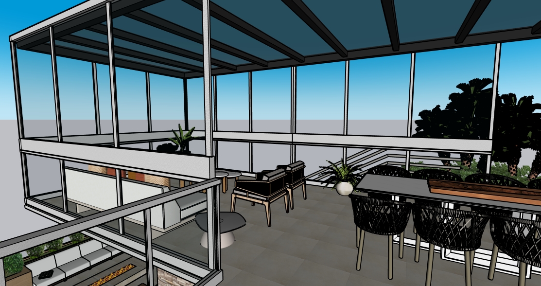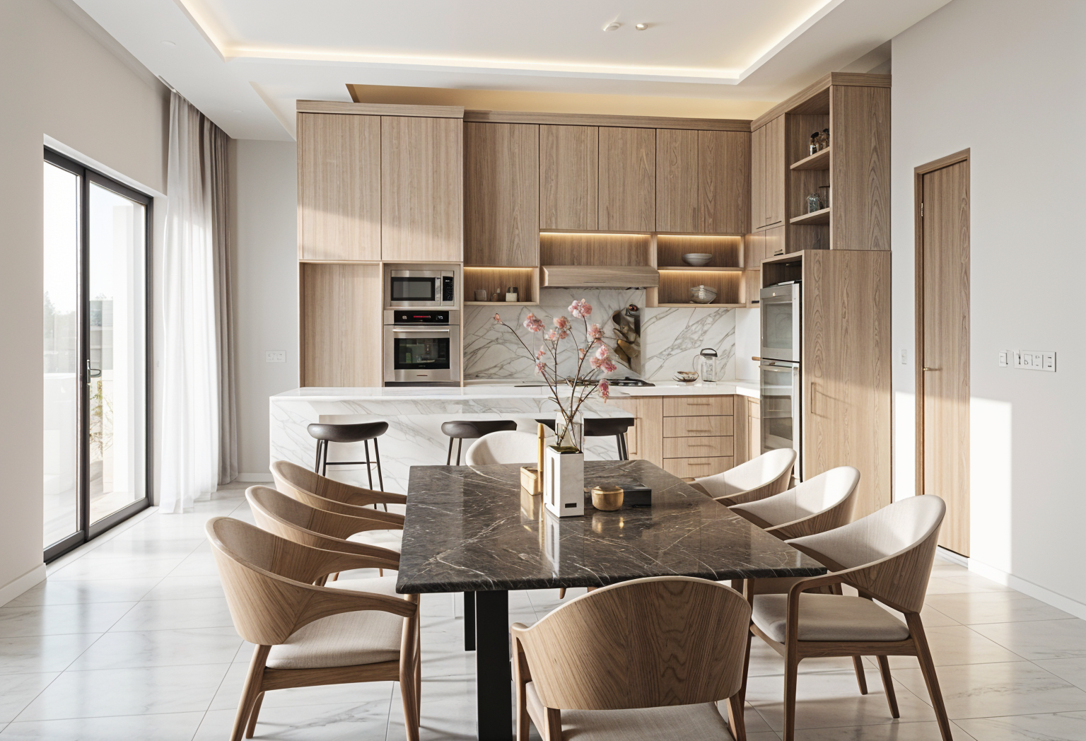render a luxurious modern outdoor terrace featuring a sleek fire pit with warm flickering flames the large umbrella is a sophisticated taupe color harmonizing with the light wooden texture of the contemporary furniture the cushions are crisp white accentuating the modern design a stone wall with lush green plants creates a vertical garden the flooring has a smooth kight beige finish complementing the vibrant blue sky and distant silhouettes of dark green trees create a relaxing elegant atmosphere with a sense of sophistication and tranquility as a background and mountain and lake view