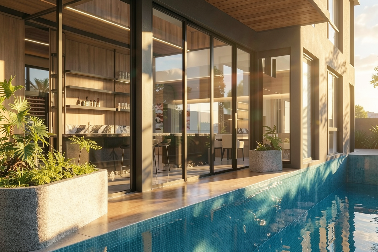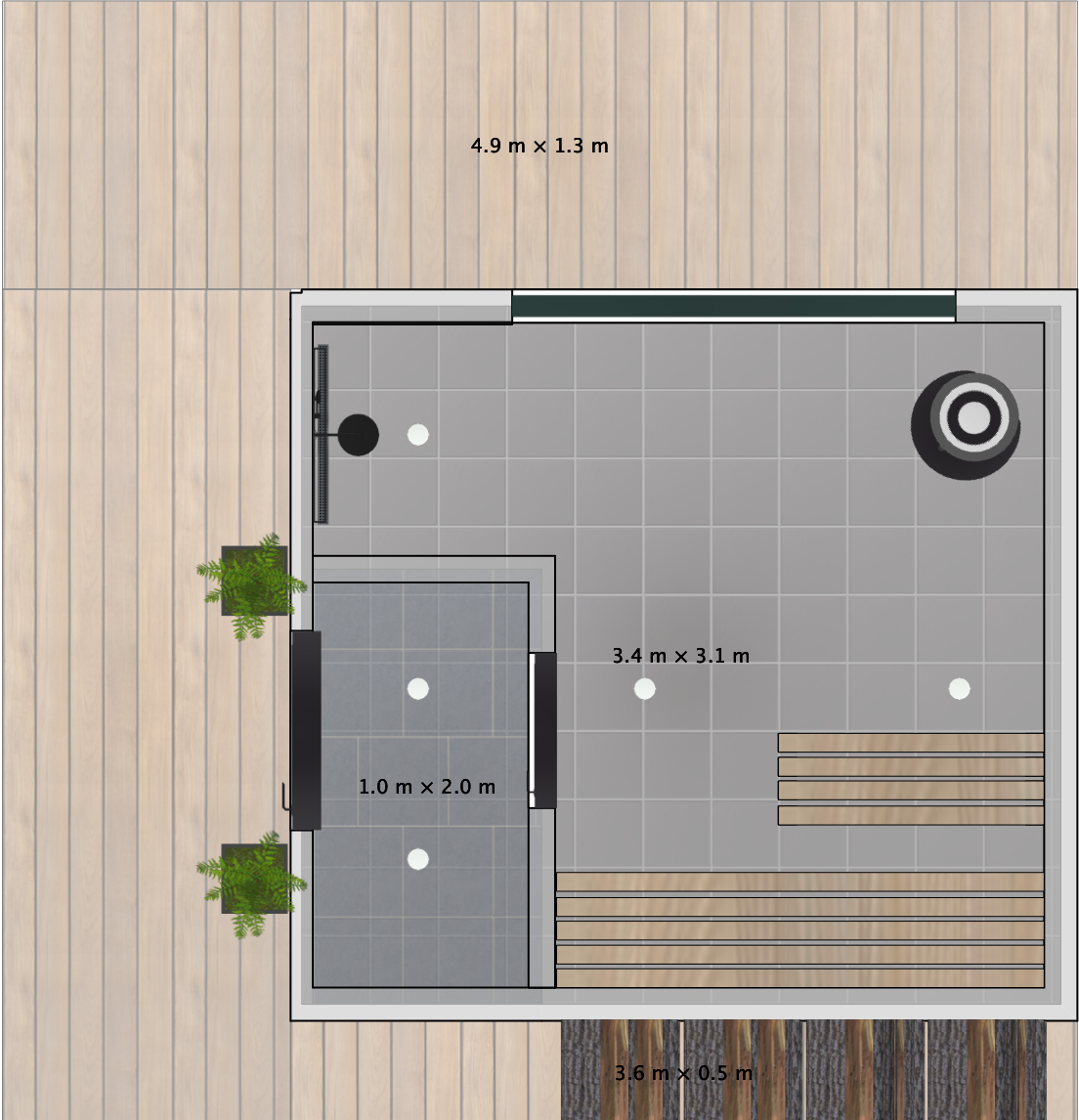 generate a photo realistic floor plan without shadows the floor tiles are charcoal the benches are blonde aspen wood there is a picture window on the top wall as marked the white dots are down lights