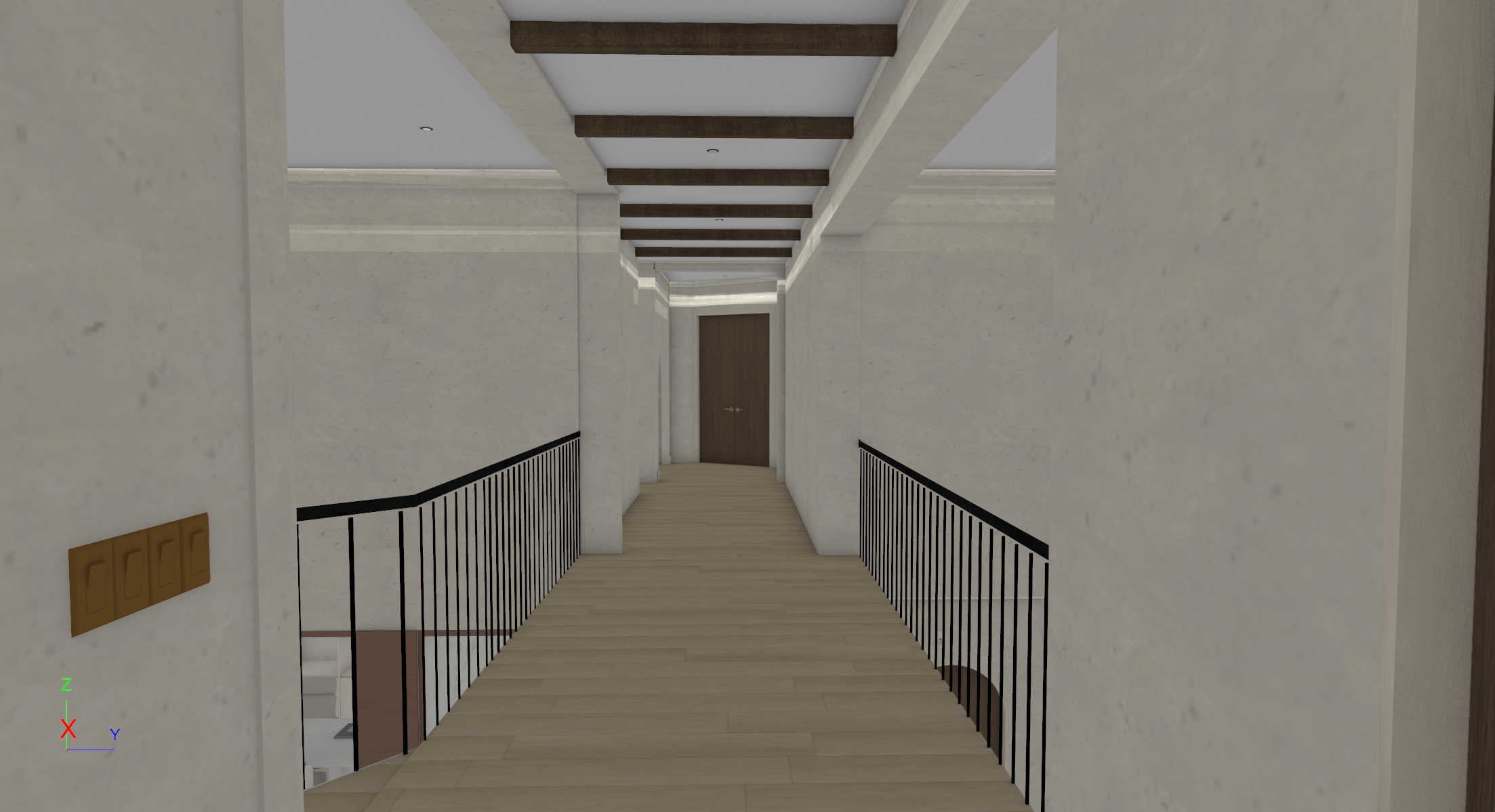 ai rendering request spanish organic mediterranean hallway create a super realistic ultra hd architectural rendering of this exact hallway do not change the layout proportions camera angle or architectural structure the image must feel warm calm organic cozy and highly detailed with realistic materials textures and lighting architecture walls walls finished in smooth hand applied microcement plaster warm off white tone with subtle tonal variation soft imperfections and natural texture edges should feel soft and organic not sharp or sterile the ceiling perimeter includes a soft recessed cove detail with warm indirect led lighting creating gentle glow washing the walls ceiling beams maintain the existing exposed beams exactly in place beams finished in medium warm oak wood matte finish visible grain and natural tonal variation ceiling between beams finished in smooth warm white plaster flooring floor finished in wide plank european oak flooring light natural tone matte finish visible authentic grain subtle imperfections and realistic plank variation floor should reflect light softly not glossy stair railings keep existing railing design and location exactly the same finish in matte black steel ultra refined minimal and elegant slight natural light reflection on metal doors door at the end of hallway finished in solid white oak vertical grain matte natural finish minimal small round knob handle in satin brass door should feel premium simple and organic lighting very important lighting should be warm soft layered and realistic include warm cove lighting along ceiling perimeter soft recessed ceiling spot lights between beams very subtle indirect wall light gradients warm light temperature 2700k lighting must create depth soft shadows calm cozy atmosphere avoid harsh or cold lighting styling atmosphere the space should feel warm minimal organic calm high end spanish mediterranean modern avoid clutter optional subtle styling one large rustic ceramic vase at end of hallway near door neutral earthy tone sand clay off white rendering quality must be super realistic ultra hd photorealistic cinematic lighting natural shadows realistic textures architectural photography quality mood keywords spanish organic mediterranean warm calm minimal elegant natural timeless luxury simplicity