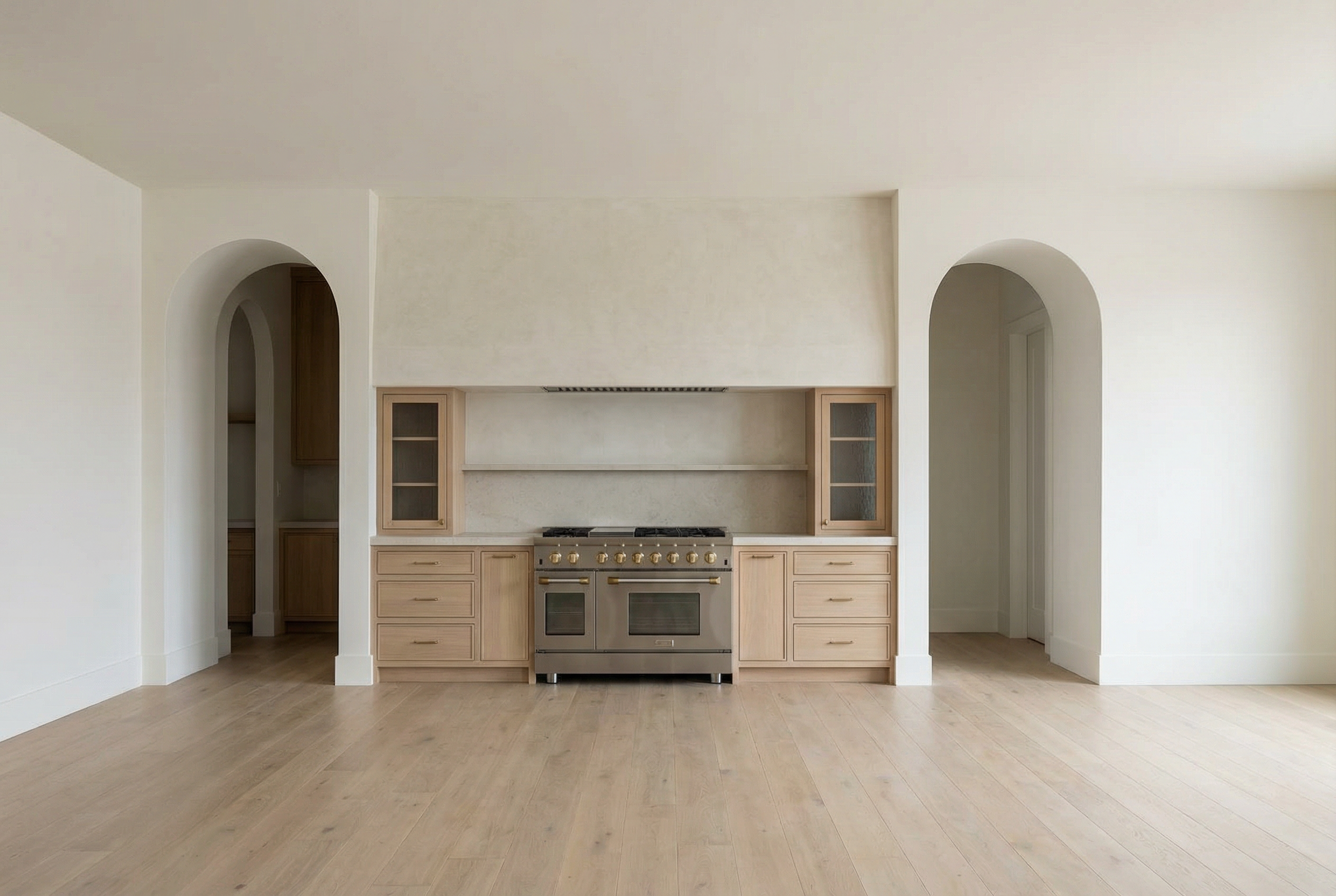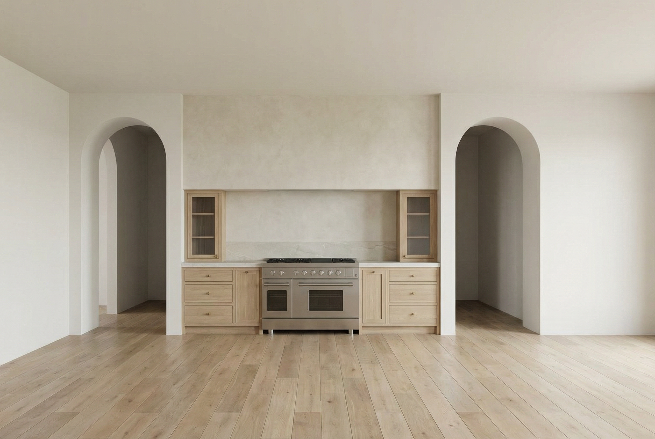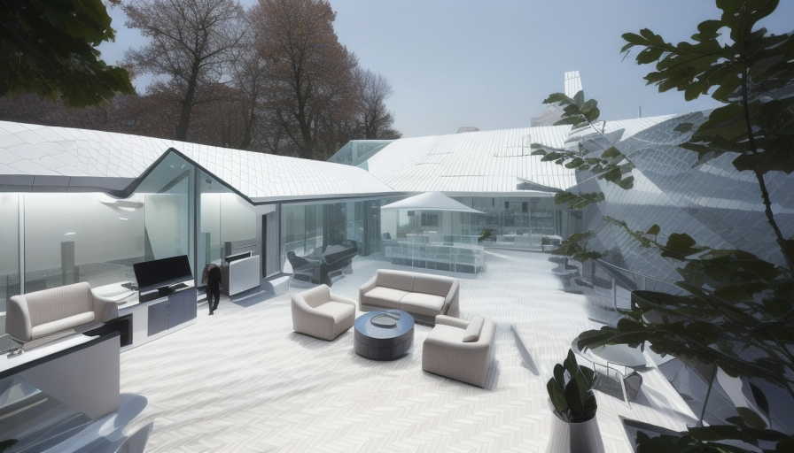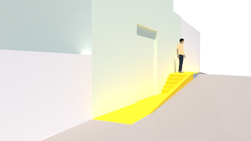 create a serene and atmospheric scene depicting a minimalist architectural structure render the walls in a smooth gradient of light mint green and off white complemented by a clear blue sky design the pathway and stairs to be bright yellow with soft ambient lighting emanating from below casting a gentle glow include a solitary figure standing contemplatively at the top of the stairs dressed in a light peach shirt and navy blue pants ensure the overall mood is calm and introspective capturing a sense of quiet contemplation and modern simplicity