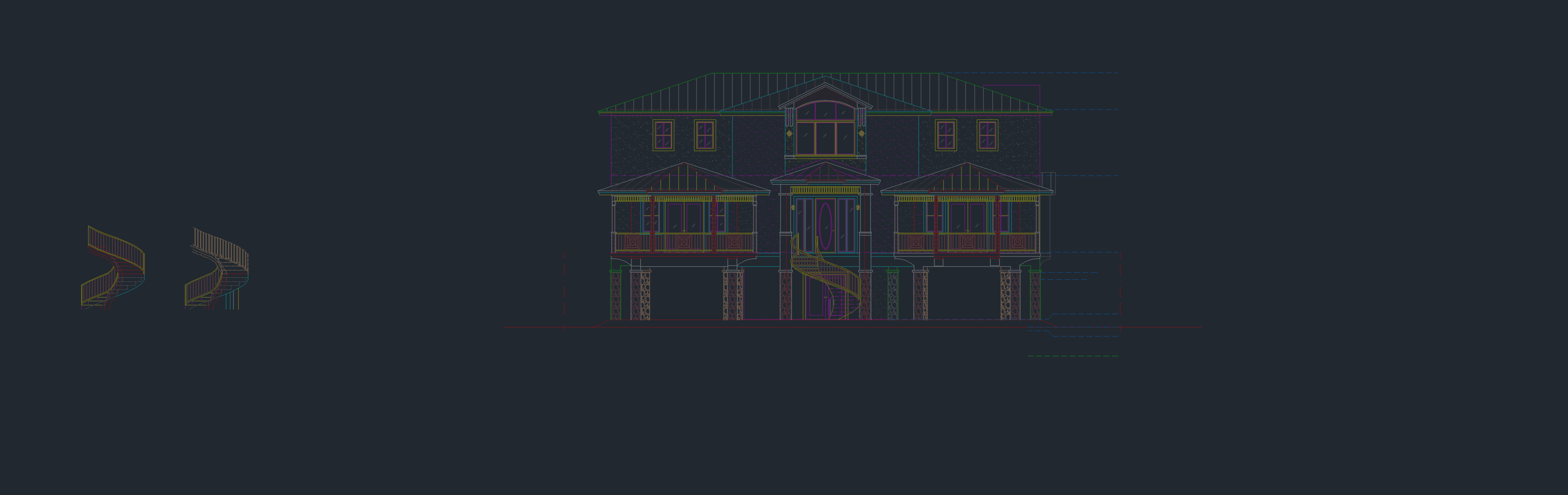 need to render this elevation make house white with black framed windows and doors no mullions make roof white metal have the landscaping be tropical with an ocean view from back of house