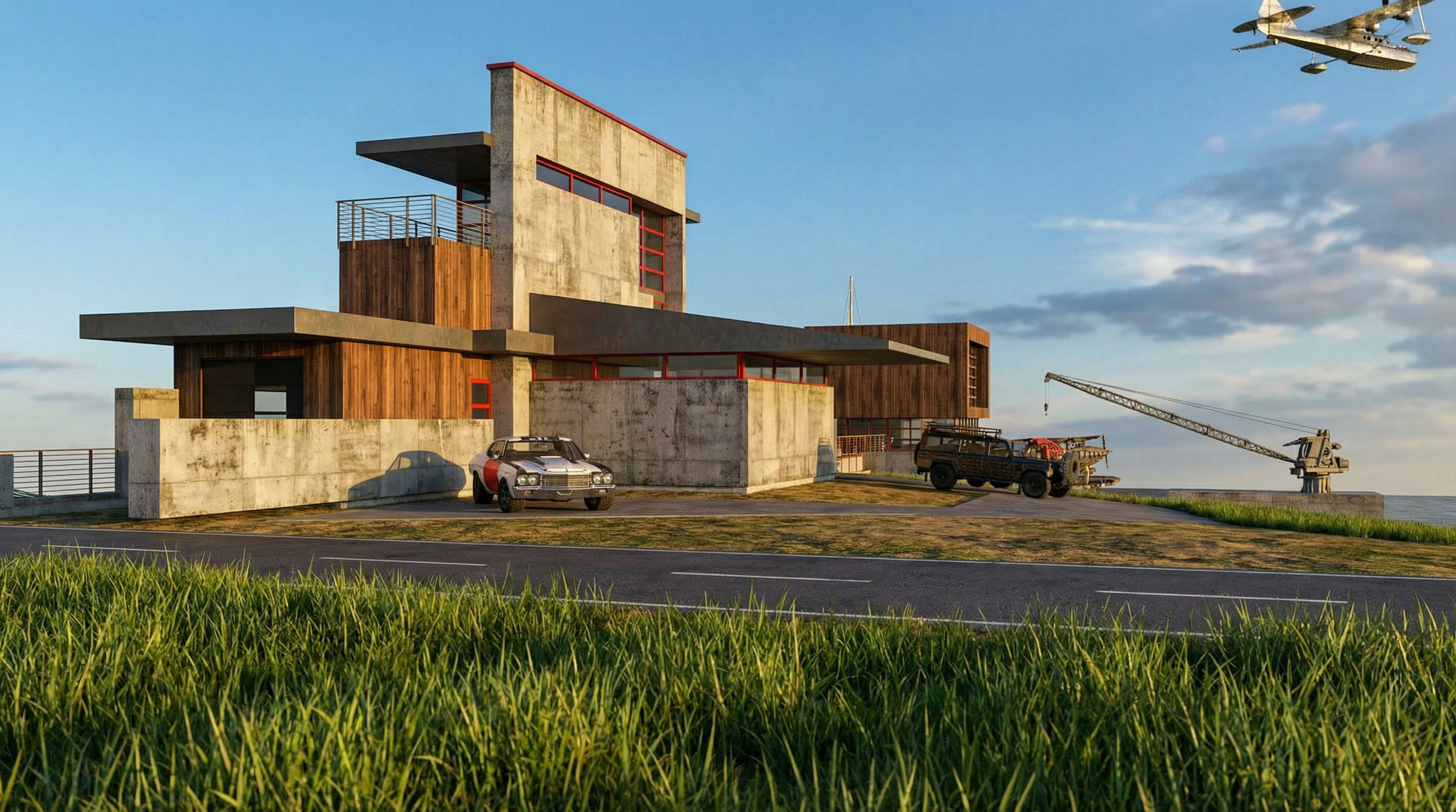 render this building metal window framing cream brick color at front add some green between buildings change horizontal floor mullion black metal
