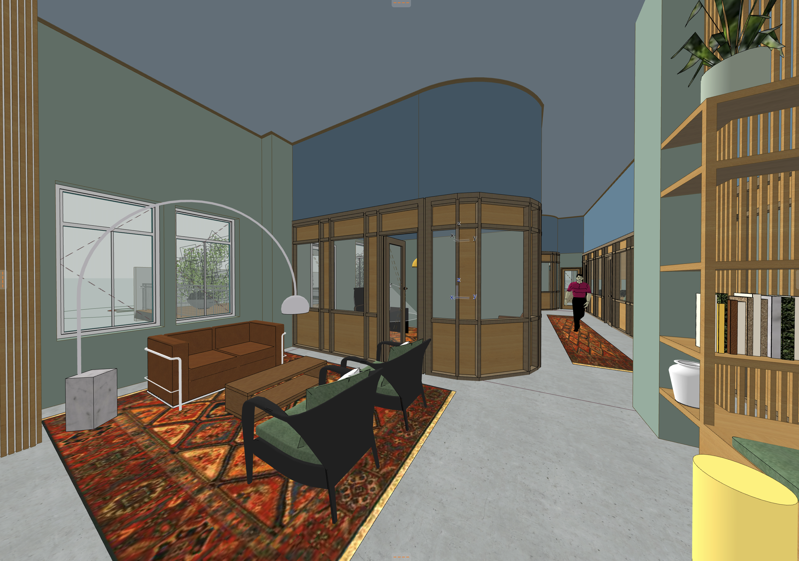 this is a a lounge in a office space maintain all colours the wood is oak the floors are polished concrete show the light coming in through the windows