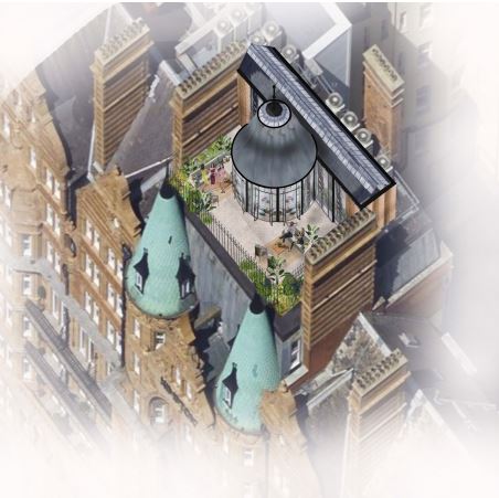 roof top terrace with people seated and standing on a sunny day the wall behind the turrets is a lead mansard roof