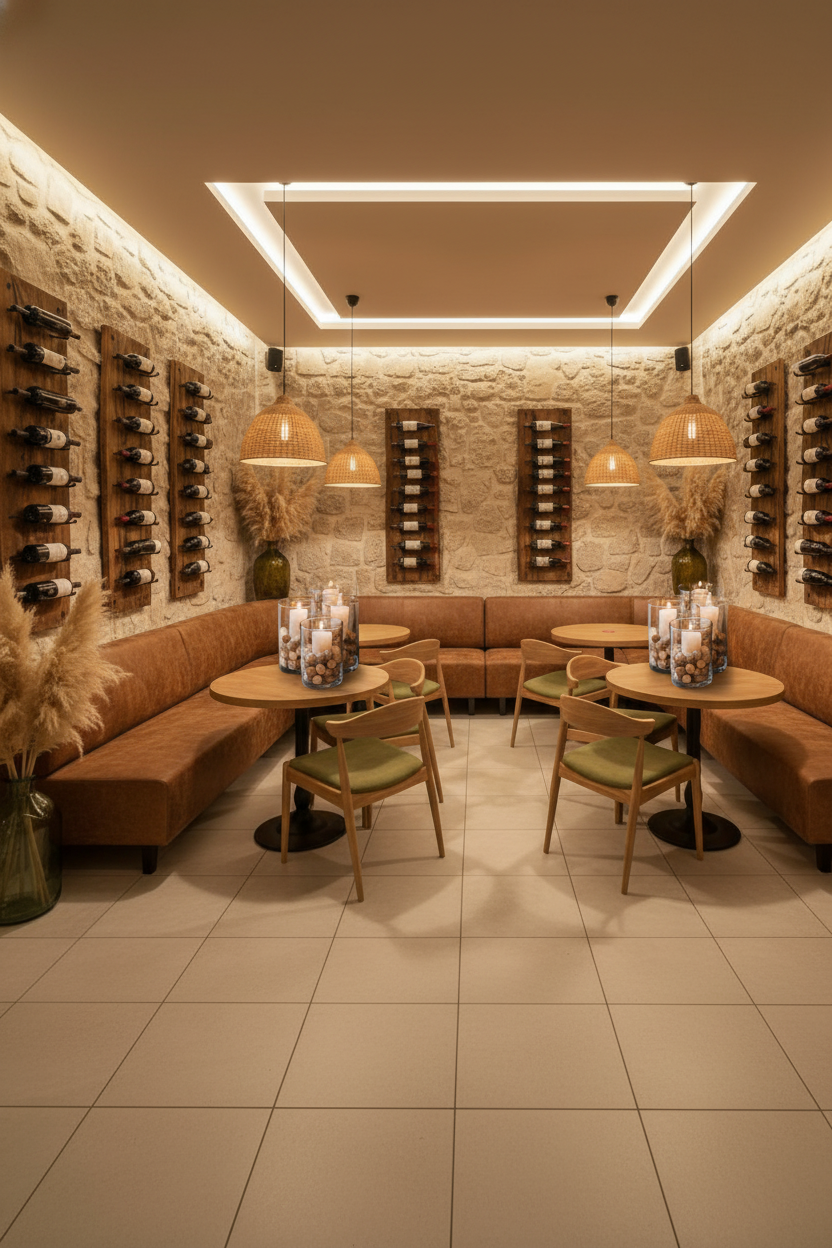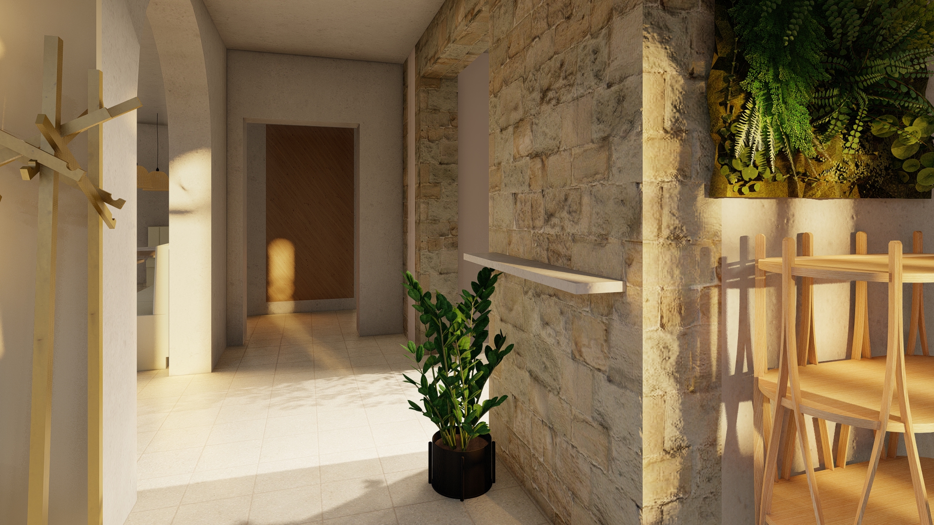 create a beautiful entrance area of a mediterranean tavern use the reference images as examples for materials atmosphere and lighting there is one more wall opening before the mirror keep this opening visible and clear the wooden surface after that opening should actually be a mirror reflective and elegant add warm mediterranean lighting and beautiful chandeliers to make the space cozy and inviting keep the image high quality realistic and detailed with a soft mediterranean atmosphere architecture