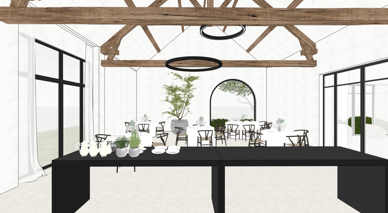 realistic looking restaurant interior in modern rural country style soft natural colours maintaining the character of the old renovated farm acoustic ceiling with sprayed cellulose flakes white color steel frame windows big round window without visible frame clay coloured walls with soft rounded edges architecture