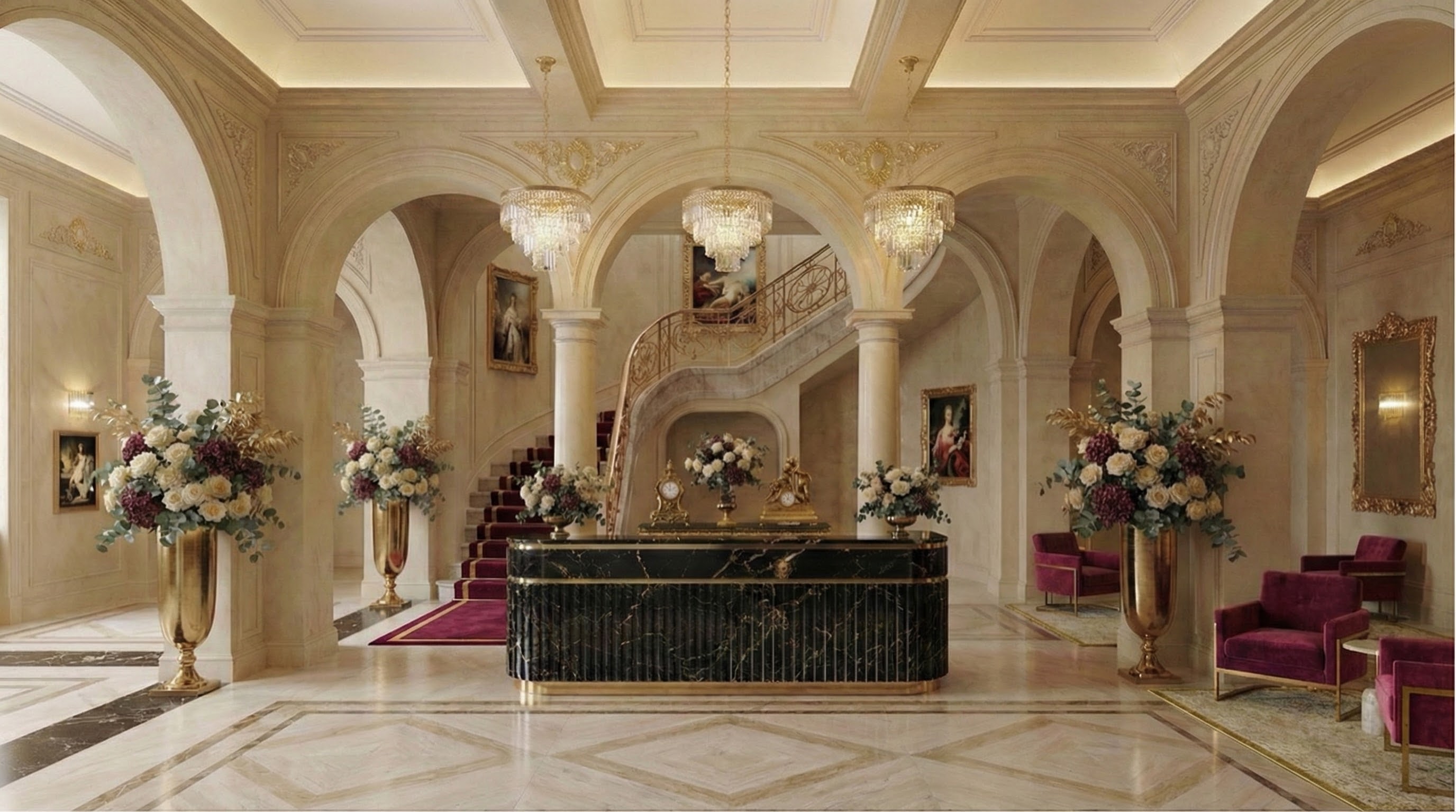 transform the space into an ultra luxurious marriott autograph collection hotel reception designed as a refined contemporary palace preserve the monumental arches and classical proportions enhancing them with premium stone textures and elegant architectural detailing introduce iconic eichholtz lighting fixtures oversized chandeliers sculptural pendant lights and refined wall sconces in brushed brass and soft gold finishes lighting should be the main statement of the space creating a warm glamorous high end hospitality atmosphere design a bespoke reception desk with luxury paneling subtle metallic accents and perfect symmetry the space must feel opulent yet tasteful elegant exclusive and timeless a signature autograph collection interior ultra realistic architectural visualization cinematic lighting editorial luxury hotel style high end materials premium european design