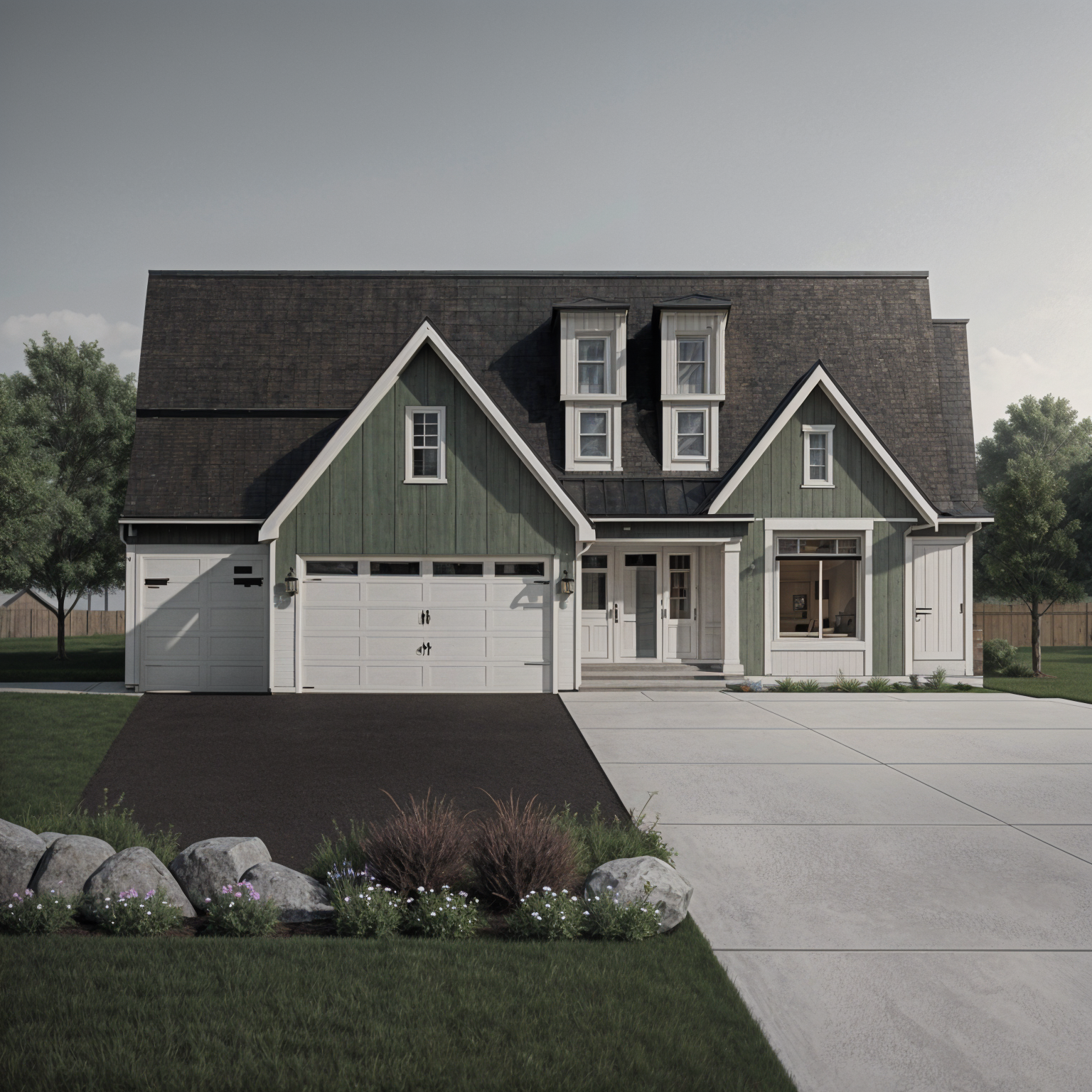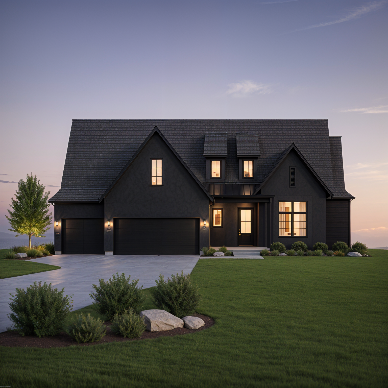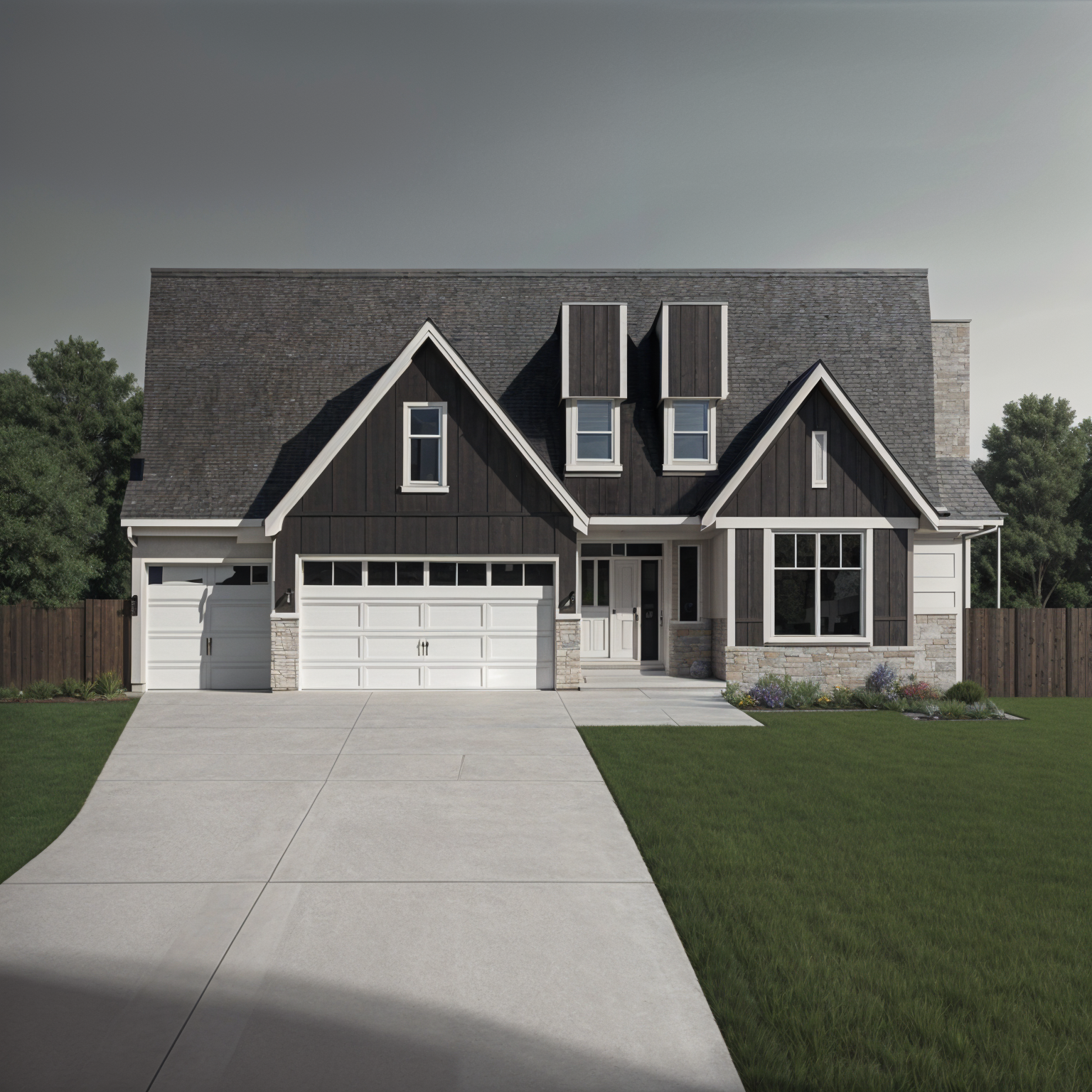 convert this black and white 2d architectural elevation drawing into a photorealistic rendering use the style and atmosphere of a modern farmhouse apply smooth dark charcoal black panel and channel siding instead of board and batten roof should be medium dark gray asphalt shingles garage doors window trim and front entry should be black for bold contrast show crisp bright sunlight with clear blue skies casting realistic shadows for a mid day feel windows should reflect daylight and hint at a bright airy interior add realistic landscaping with green grass small shrubs accent rocks and a small tree in front driveway should be dark asphalt final rendering should look natural and high quality like a professional real estate photo taken on a sunny day architecture