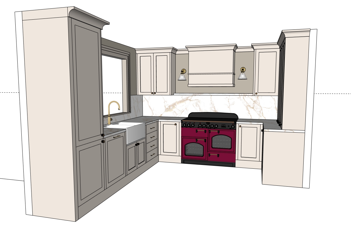 interior shot a cozy and elegant kitchen interior well lit with a soft ambient glow the cabinets are a warm beige with a smooth satin finish the countertops are a sleek granite complementing the classic farmhouse sink with a polished brass faucet the backsplash is a luxurious white marble with subtle elegant veining the range oven stands out in a bold deep burgundy adding a touch of rich color above the oven classic sconces with brass fixtures and soft white glass shades provide gentle lighting the atmosphere is inviting and sophisticated a perfect blend of modern and traditional design elements