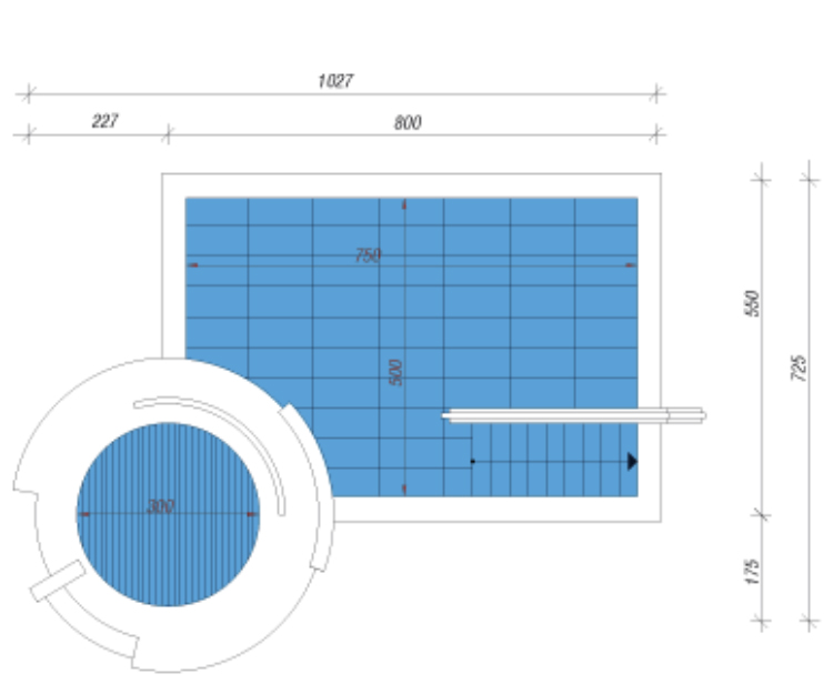 please make a 3d view for this swimming pool and round baby pool area premium luxury hotel pool finished with blue and white mosaic add water attractions dedicated for babies and in main pool add swan neck for a shoulder massage