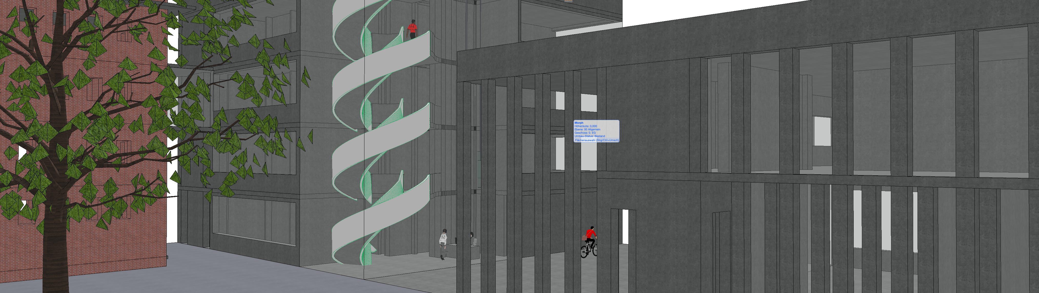 realistic architectural rendering of a modern office and workshop complex made of gray exposed concrete with subtle bronze tones and large glass windows the complex consists of a low elongated workshop hall and an adjoining office building on the left featuring a clearly visible spiral staircase inside the glazed foyer the staircase should not be built into the fa ade but stand freely behind the transparent glass beneath the arcade area facing the plaza there is a caf with outdoor seating tables and chairs arranged neatly under the sheltered space creating a welcoming and lively atmosphere the scene shows an asphalted plaza with a few parked cars people walking and cyclists passing through surrounded by small green islands and trees the setting lies in a flat industrial landscape with no neighboring buildings behind the complex railway tracks run across the terrain and in the far distance the silhouette of an airport can be seen on the horizon the entire scene is illuminated by warm dusk lighting soft evening glow with bronze reflections on glass and concrete surfaces creating a calm cinematic and atmospheric mood the style should remain realistic and consistent with the reference image don t change the perspective architecture