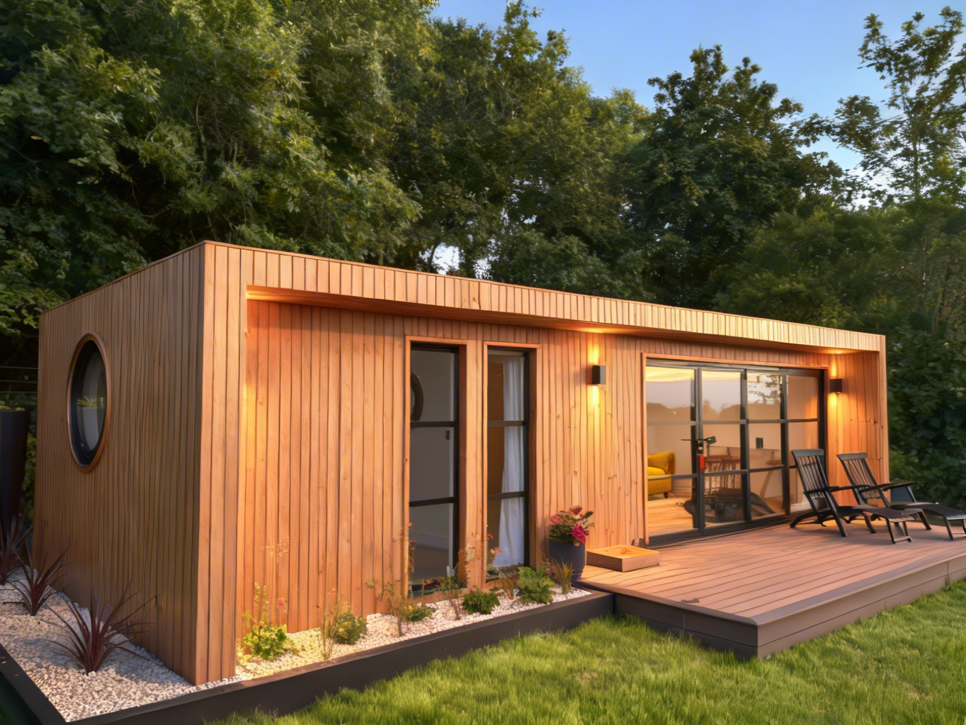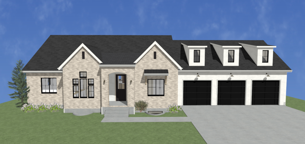a charming soft creamy house and beige brick accents a soft cream color for the stucco areas a black shingled roof with metal roofs on dormers black garage doors bronze exterior lights a manicured lawn with native plants a soft blue sky with white clouds that softens the sun pine trees scattered behind with mountains behind