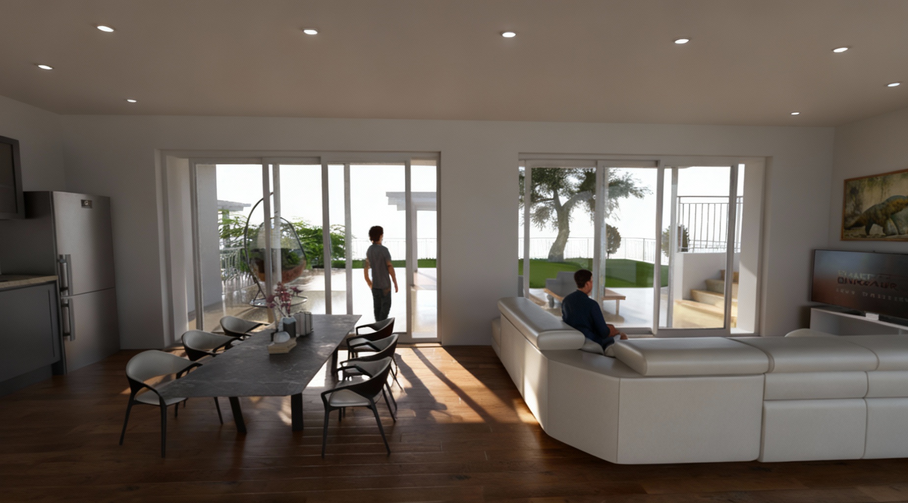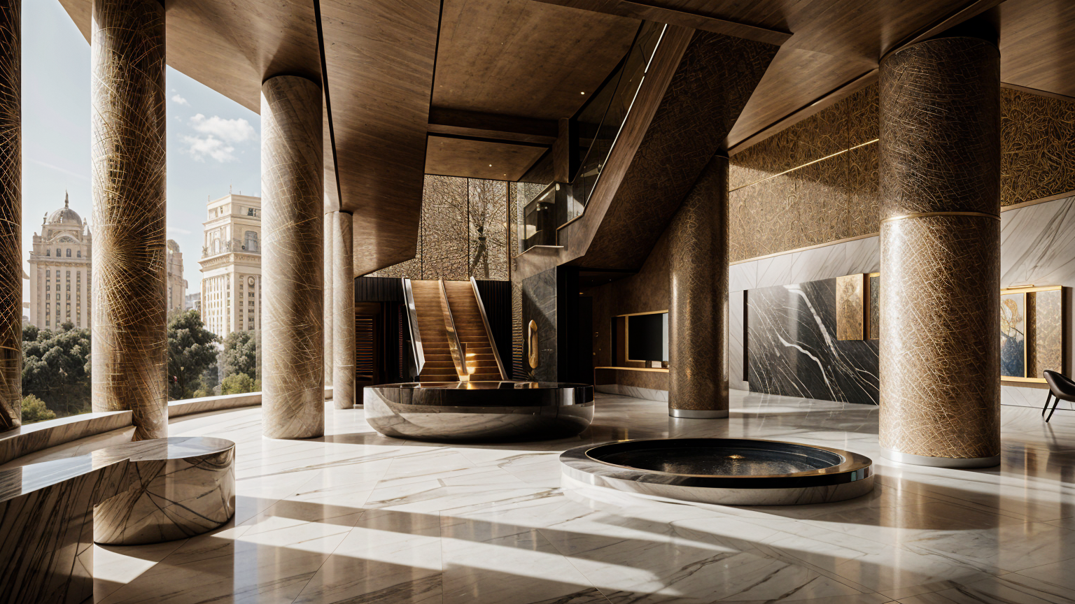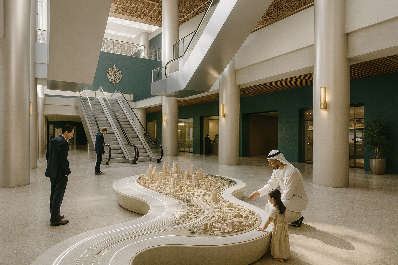 interior shot render a refined civic atrium using offwhite and beige materials throughout maintain the original spatial composition and camera angle introduce subtle pops of deep emerald green on select wall panels and signage add brass vertical light sconces to the cylindrical columns in the center of the walkway integrate a neutral toned raised dubai city model with embedded led pathways softly glowing to suggest urban connectivity on the right include a modest caf with warm lighting and simple seating incorporate emirati figures such as a man kneeling beside a child and a woman seated contemplatively to evoke cultural presence and storytelling the overall mood should be minimal trustworthy and quietly elegant
