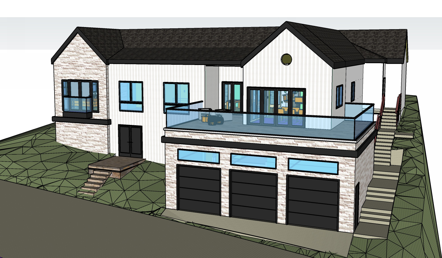 use artic white stone where stone is shown vertical white siding black garage doors and trim around windows clear glass railing for deck and juliet balcony