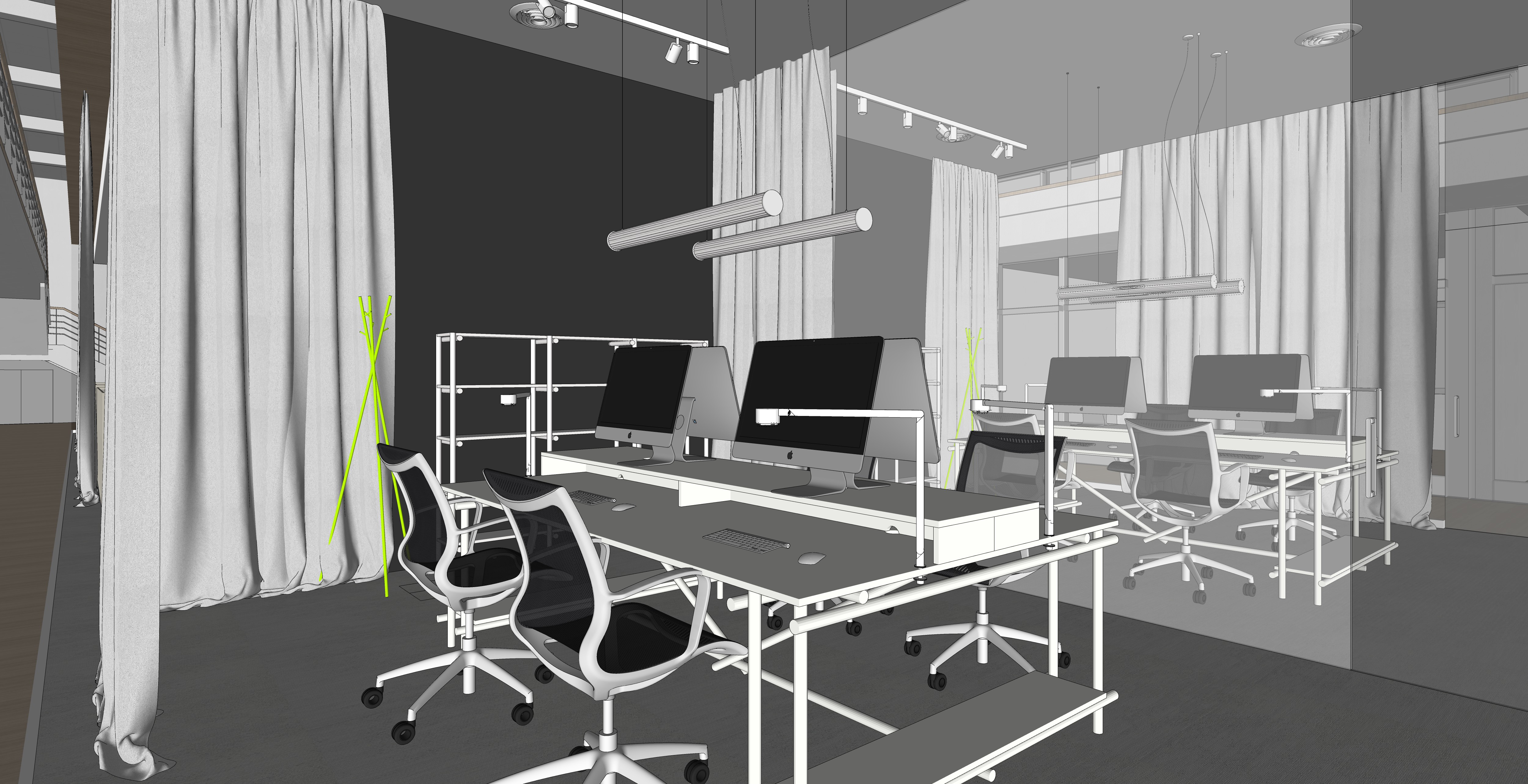 photorealistic visualizations of office spaces transparent glass walls or natural white plaster interiors with predominantly white color technical floor light gray carpet