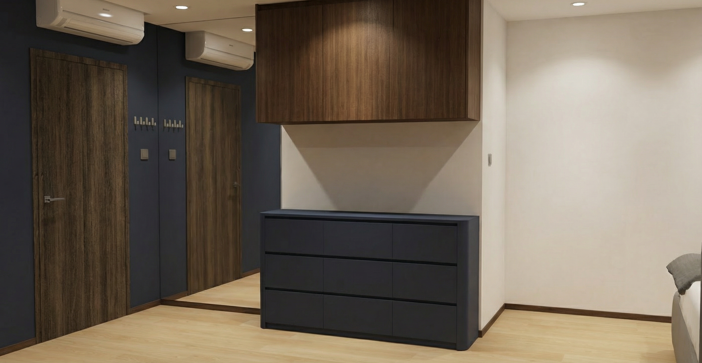 the vertical and horizontal supports are weathered steel the top cap and bottom skirt are crema siena marble the floor is a deep blue carpet