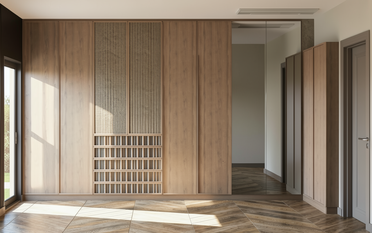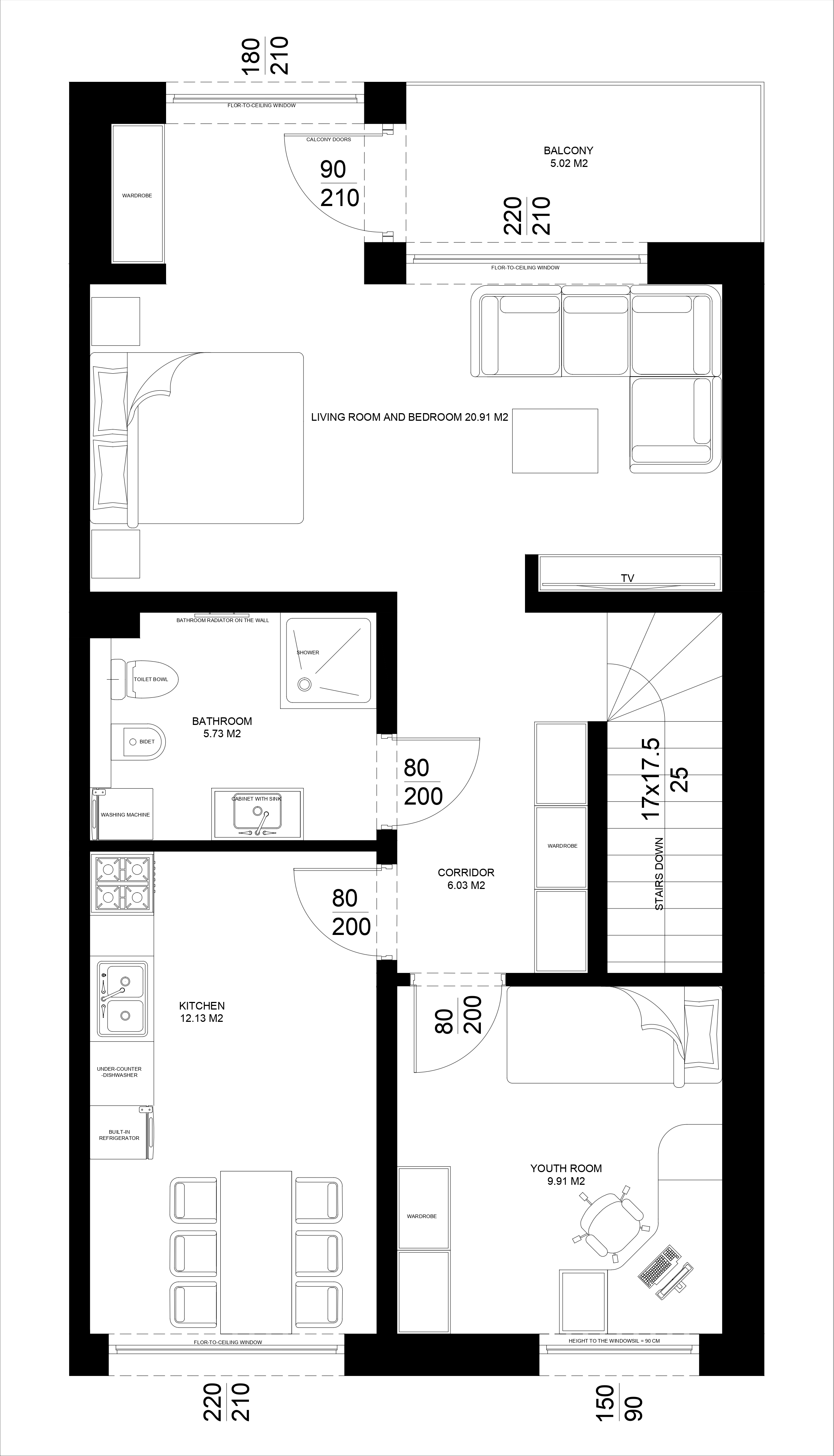 convert this floor plan into a realistic isometric 3d view of a full house show the space from an elevated angle with furniture walls and details visible do not show descriptions loft style apartment the stairs go up to another apartment the door next to the stairs leads to the room under the stairs use the same furniture as shows on the plan do not change the orientation of the floorplan