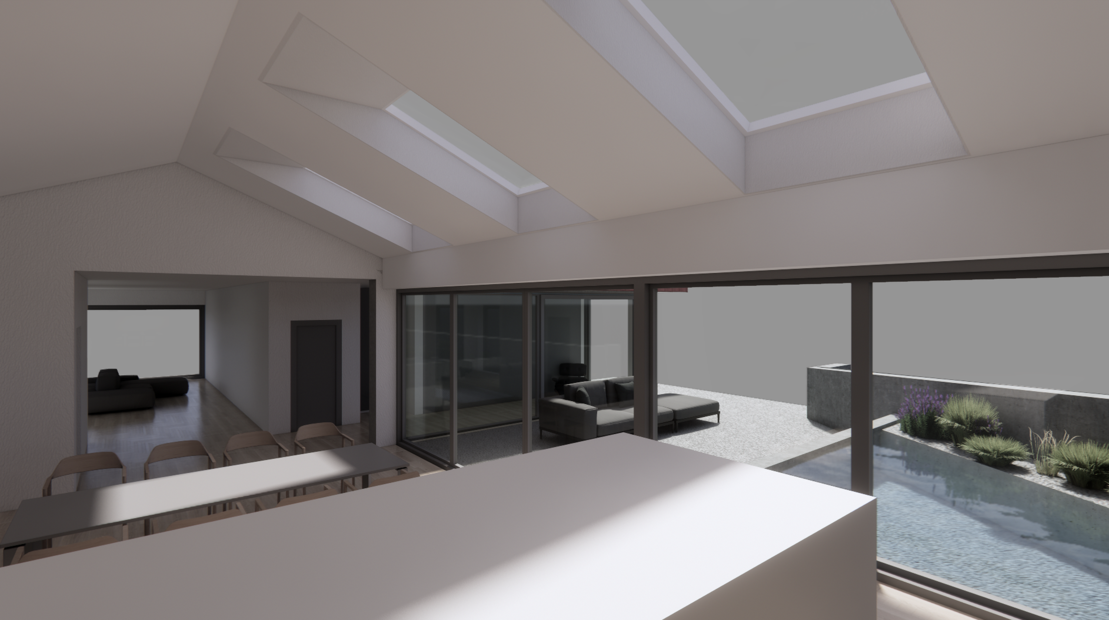 make it more realistic and modern keep the geometric outside the window are more plants no reflections in the window make it a bright interior with a lot of sunshine