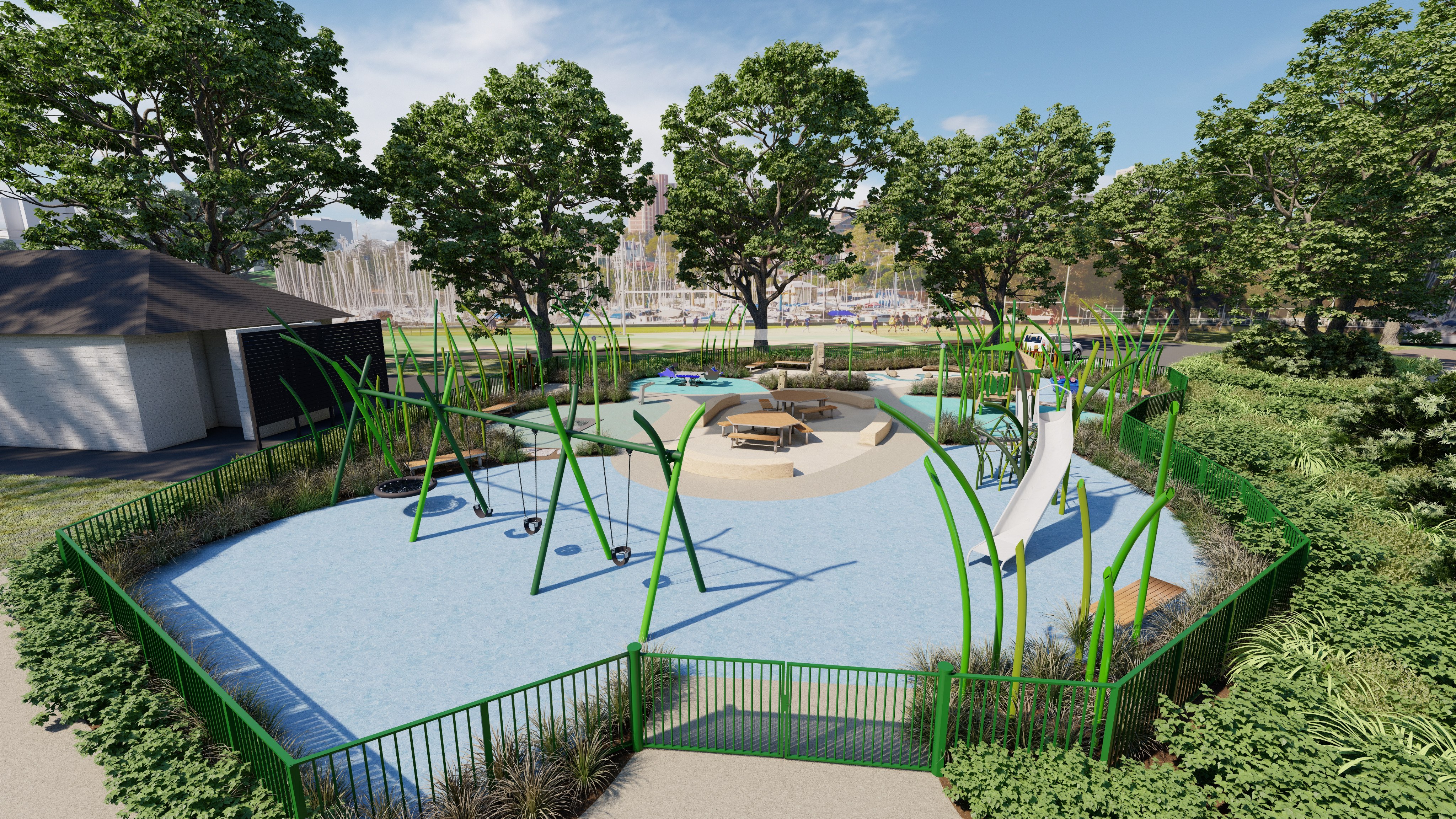 children playground kids playing on equipments parents around some parents sitting on the picni set realistic render