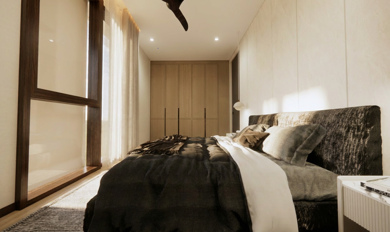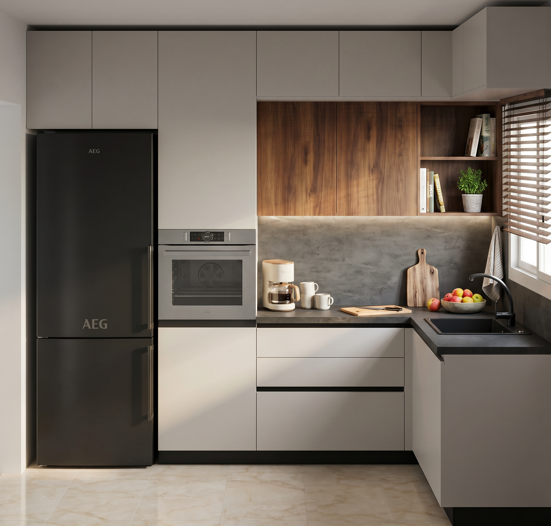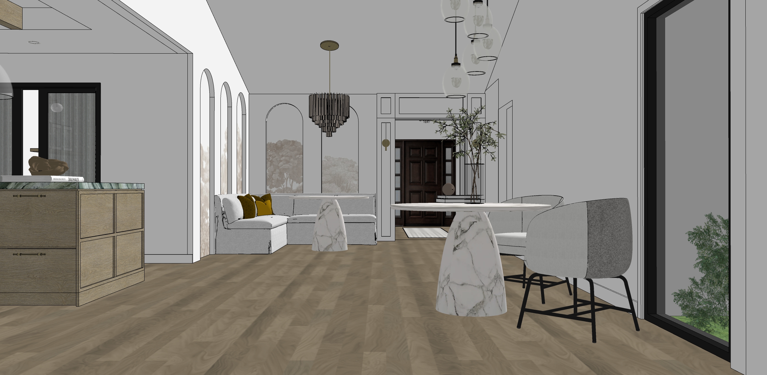 create a render in hyper realistic architectural visualization quality 8k resolution all objects furniture sanitary ware and architectural features must remain in place do not add any objects or delete anything from the image the spatial configuration must remain unchanged warmth gentle reflections soft shadows enhanced color richness and luxurious level realism improve depth and realism through wood grain richness brass highlights fabric texture and polished clarity while keeping the entire scene exactly as originally designed use general daylight lighting in the room but not too bright use a smooth white wall surface above the tiles the wall covering should be the same light color as the floor covering light is coming from kitchen windows on the left side and the light above the dining table is crystal and have a low light intensity in it floor is wooden laminate and all the wood in the scene to be light oak but not too red or yellow make the door color dark charcoal the sun intensity should be like 5 pm in summer day keep the style and color of the wallpapers in those arcs as is and do not change it