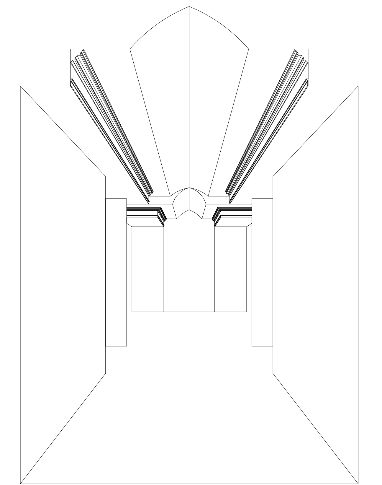 interior perspective of a magazine reception area inspired by middle age modern aesthetics elegant and avant garde a vaulted golden ceiling forms a glowing cross reflecting soft indirect light main axis leads to the secretary s desk framed by two carved and aged dark wood panels two benches with two seats symmetrical layout emphasizes balance resembling a fashion runway rich yet minimalist details warm golden reflections blue red textured gothic wood refined and professional atmosphere
