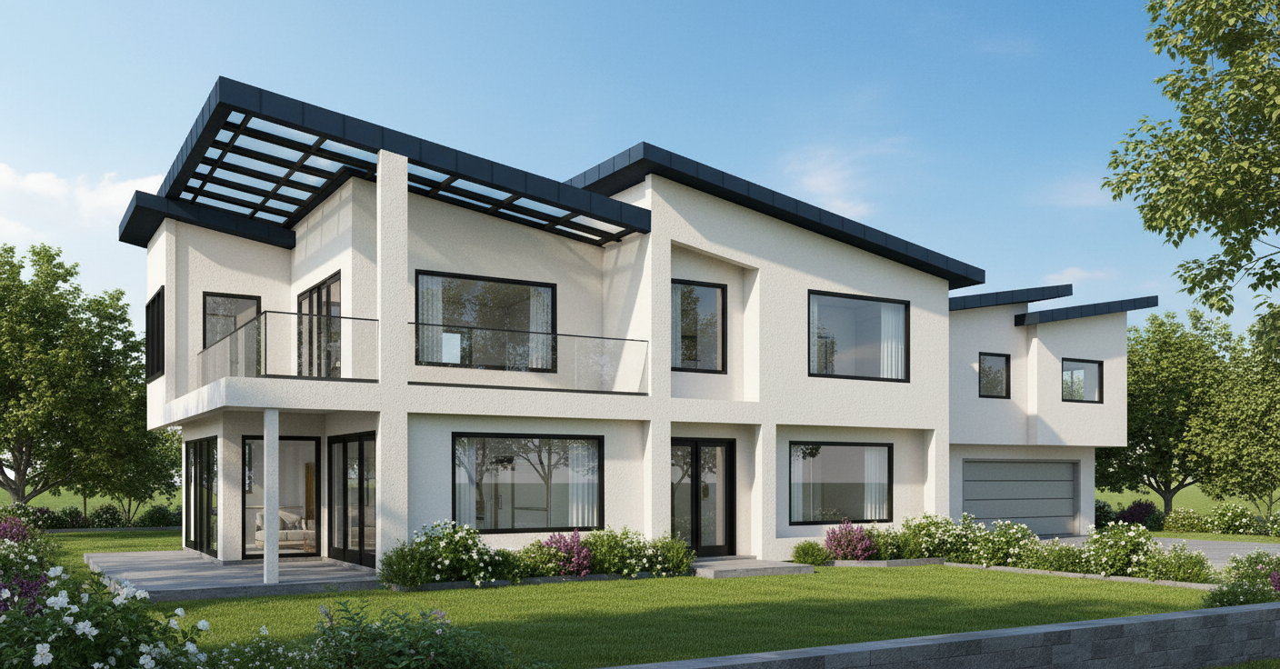 architectural illustration transformation based strictly on the provided image non negotiable constraints preserve exact volumes preserve roof geometry preserve fa ade proportions preserve openings and railing preserve retaining wall geometry preserve camera position and framing no architectural redesign style reference contemporary architectural editorial illustration with soft watercolor influence similar to a refined architectural competition board rendering visual treatment soft daylight slightly warm gentle diffuse shadows subtle contrast no harsh cgi lighting no hdr materials reinterpretation white fa ade with light mineral texture and subtle imperfections vertical wood cladding warm and natural slightly desaturated stone retaining wall softened less contrasty more matte asphalt darker but velvety not glossy glazing lightly reflective but understated vegetation treatment soft watercolor foliage effect layered green tones light translucency organic edges dappled leaf shadows on fa ade slightly painterly canopy without losing realism atmosphere calm editorial competition board aesthetic slight artistic wash crisp structural lines reduced photoreal gloss balanced tonal range optional refinement for stronger competition aesthetic very subtle paper texture overlay slight desaturation of global palette fine line reinforcement on main edges controlled grain