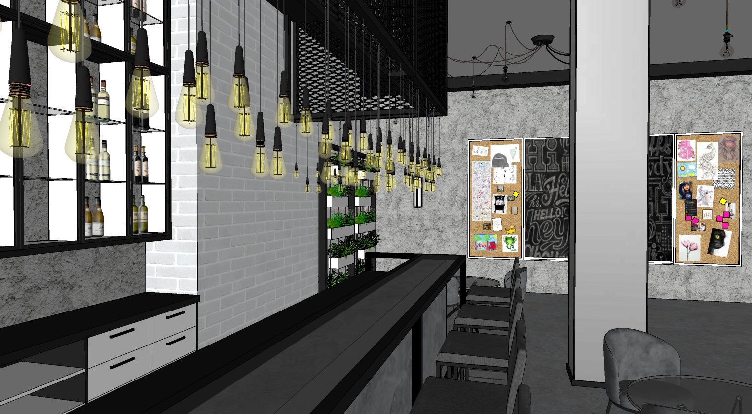 photorealistic modern hotel lobby minimalist industrial style black metal structural elements and frames gray microcement floor and walls large vertical mirrors only on the side walls white painted brick walls ral 9003 reception with gray microcement panels and black metal frame high ceiling with black metal beams and large white ceiling panels between them warm edison pendant lamps suspended at different heights and modern black wall sconces relaxation area with gray upholstered armchairs and sofas black round coffee tables lime green accent pillows and houseplants in black pots soft diffused daylight entering the lobby from the garden luxury boutique hotel atmosphere balanced composition clean geometry ultra realistic materials pbr textures realistic transparent glass with natural reflections global illumination architectural photographic lighting 24mm lens eye level camera 8k photorealistic render columns have mirrored surfaces no mirrored door reflective metal door chrome door opaque door solid metal door transparent glazing with visible garden behind the glass garden cafe terrace visible through the glass outdoor tables and chairs lively but elegant hotel courtyard realistic material imperfections fine microcement texture natural lighting reflection archview photography