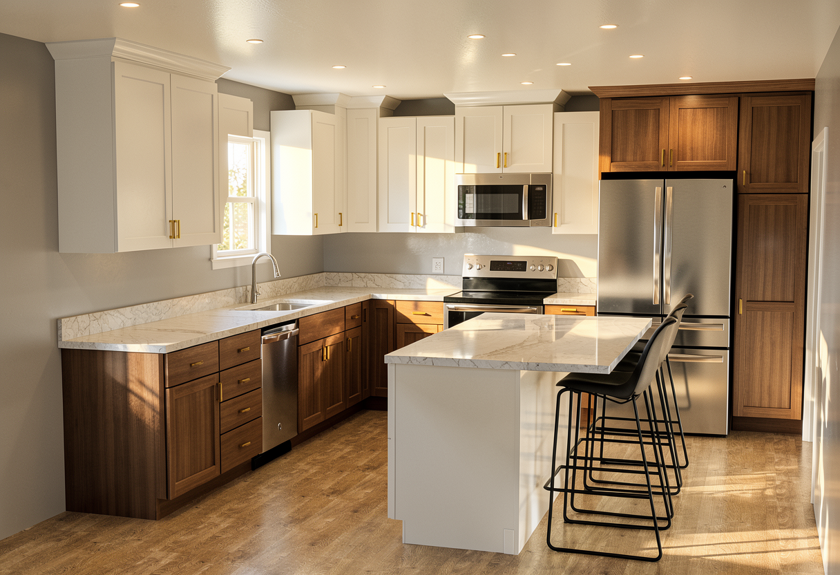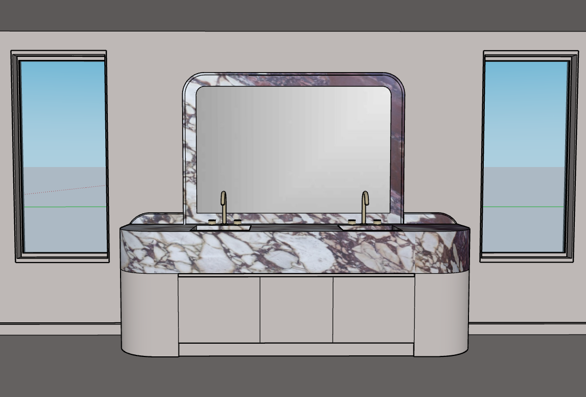 render the space in hyper realistic visualization quality at 8k resolution keep the vanity exactly as shown with all existing textures and materials unchanged the floors walls and ceiling should all use the same continuous limewash texture as in the reference image clearly showing a soft limewash painted finish rather than a flat color the mirror should have a gentle natural reflection so it reads clearly as a real mirror include three small recessed ceiling light positioned above the vanity through the windows trees should be visible outside to create a natural exterior view the overall image should feel realistic calm and natural with accurate lighting and material texture