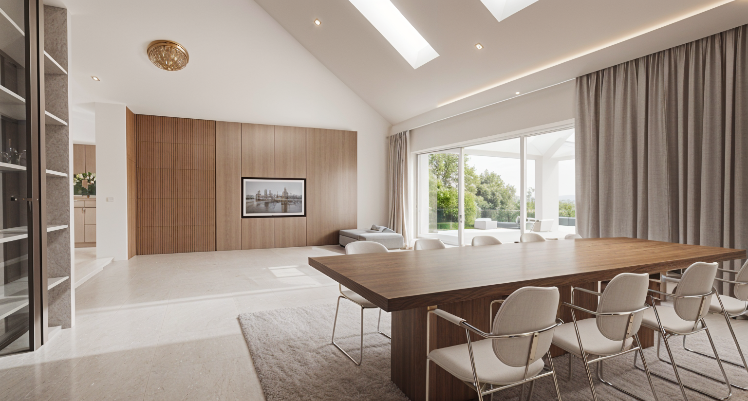 futurism wide angle shot create a modern industrial workspace with a sleek futuristic atmosphere include robotic arms and high tech equipment use a neutral color palette with shades of gray for the walls and floor add accents of deep orange on machinery and incorporate green from vibrant indoor plants highlight the workspace with warm ambient lighting from overhead fixtures to create a welcoming and innovative environment add touches of wooden textures for the stools and ensure the glass doors are highly polished include a black bar counter with white stools adding contrast and sophistication architecture