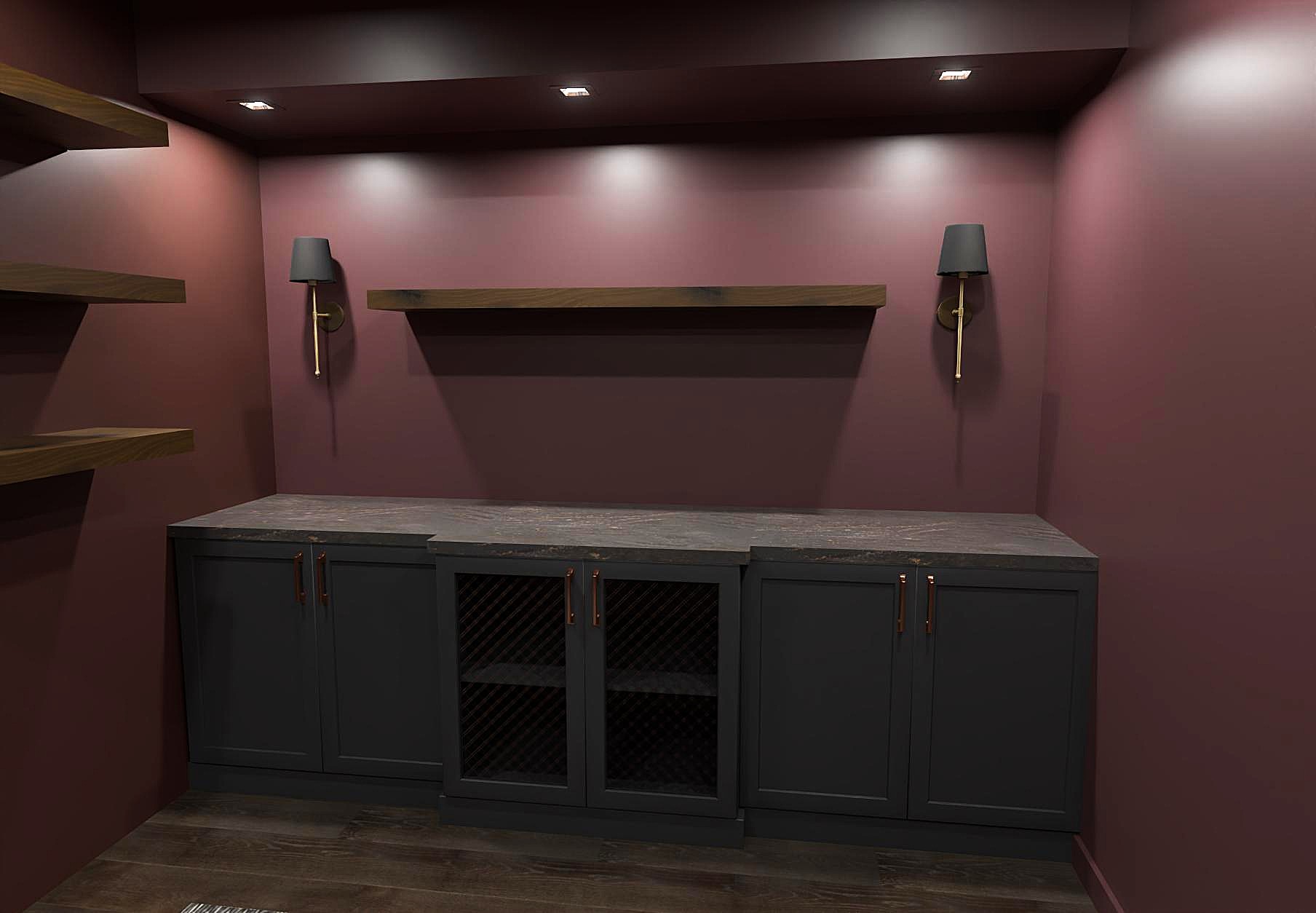 fill back wall shelves right wall shelves and counter top with bourbon bottles only empty room