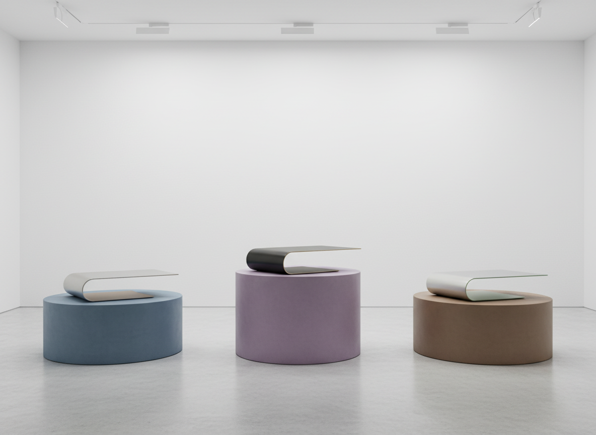 a minimal high end gallery interior showcasing three sculptural modern tables each formed from a single flowing curve the tables sit on cylindrical podiums in matte pastel colors blue lavender and warm brown the tables themselves feature sleek metallic finishes in silver black and ivory the space is bright with soft even lighting polished concrete floors and clean white walls the overall mood is luxurious calm and contemporary emphasizing pure form balanced proportions and quiet sophistication