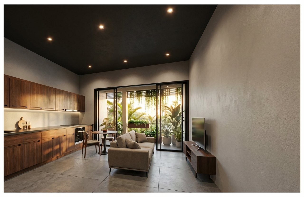 this is a proposed jimmy john s to be located in an airport transform the provided restaurant interior image into a high end photorealistic render with warm lit atmosphere and relaxed upscale energy while keeping everything exactly the same same proportions same equipment same ceiling curves same wall finishes same materials while making them look realistic and same spatial configuration the only material i want changed is the glass under the wood railing change this glass to a decorative metal panel design a design based on jimmy john s and chicago a chicago airport would be ideal add people with suitcases waiting for food and ordering a person can be ordering at the counter on the left side a couple people can be waiting in line and a couple people can be using the digital kiosks to place an order on the right side add an image to the digital kiosks so it looks like a real jimmy john s ordering screen and it looks like someone is using them to place an order add a few jimmy john s employees behind the counter one can be taking a payment one can be handing a bag over the counter to a customer and one can be in the process of making a sandwich add 3 jimmy johns bags total to the wooden pick up shelves directly to the right of the digital order kiosks ensure the scene is well lit and the lighting looks realistic do all of this while keeping the camera angle existing materials wall signage and other composition exactly the same do not add any additional materials not shown in the provided image