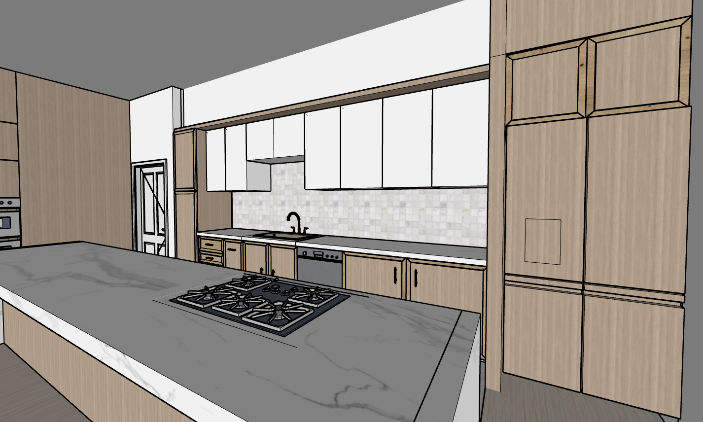 modern kitchen design featuring built in cabinetry the cabinets should be a combination of white and light natural wood tones with no visible handles for a sleek minimalist look include a marble backsplash section on the main wall behind the kitchen area and keep the rest of the wall white add subtle led strip lighting underneath the upper white cabinets so that it reflects softly onto the marble backsplash and countertop the overall design should reflect a clean bright and contemporary aesthetic
