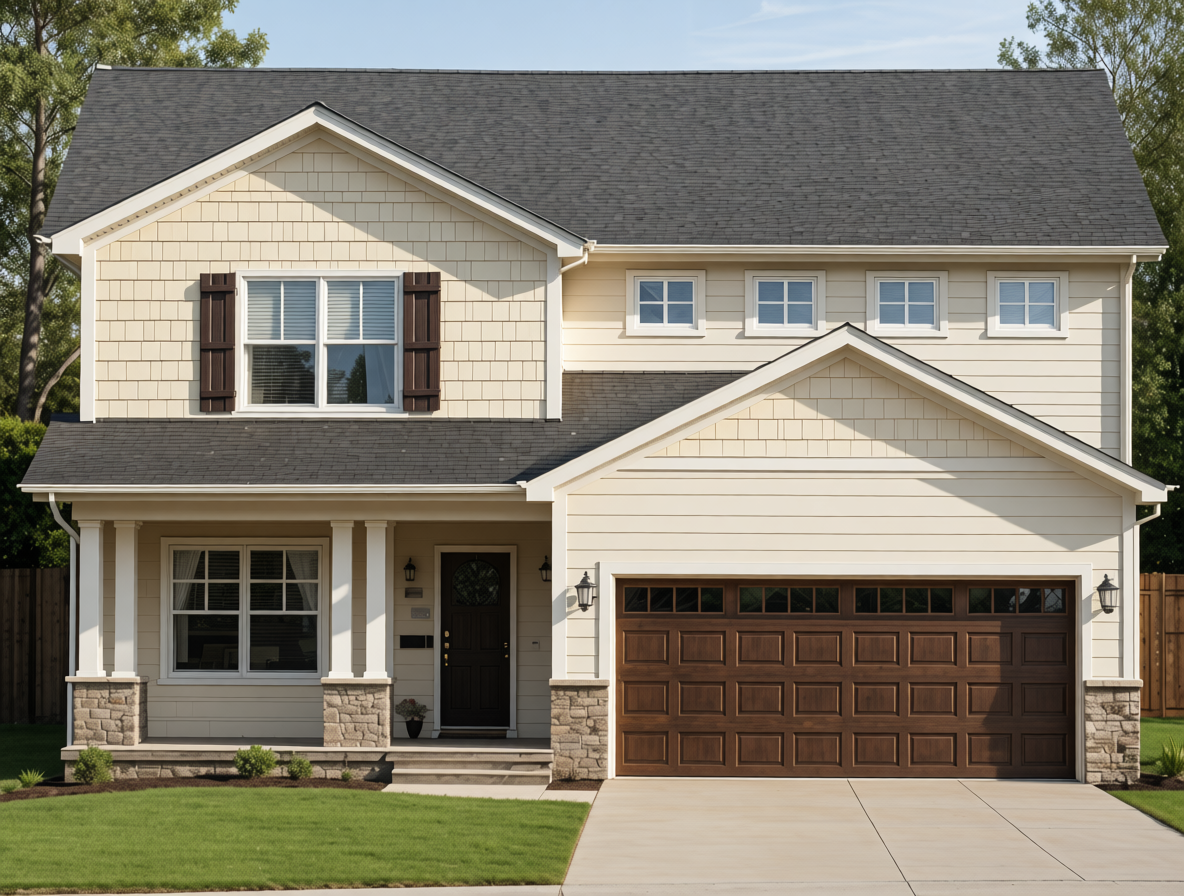 change only the siding to white and the shakes above the porch to light tan and change the shakes above the garage to light tan