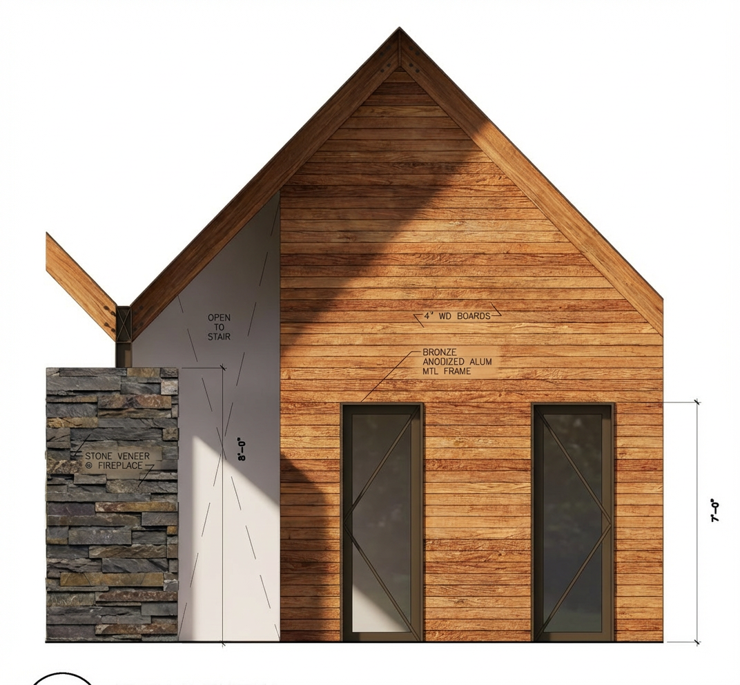 gray cedar wall and doors the fireplace is board formed concrete with glazing in background light from right side