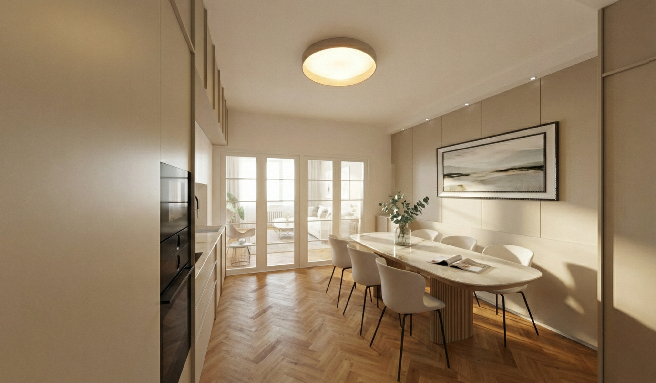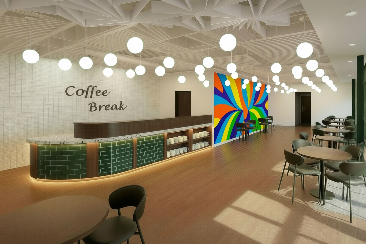 luxurious lounge interior featuring rich navy blue curved sofas deep emerald green velvet chairs and sleek white marble topped tables with golden bases the walls are adorned with elegant art deco wallpaper patterns in black and gold adding sophistication the floor is a warm polished hardwood and overhead soft pendant lights cast a gentle inviting glow a vibrant orange ottoman adds a pop of color enhancing the cozy and upscale atmosphere
