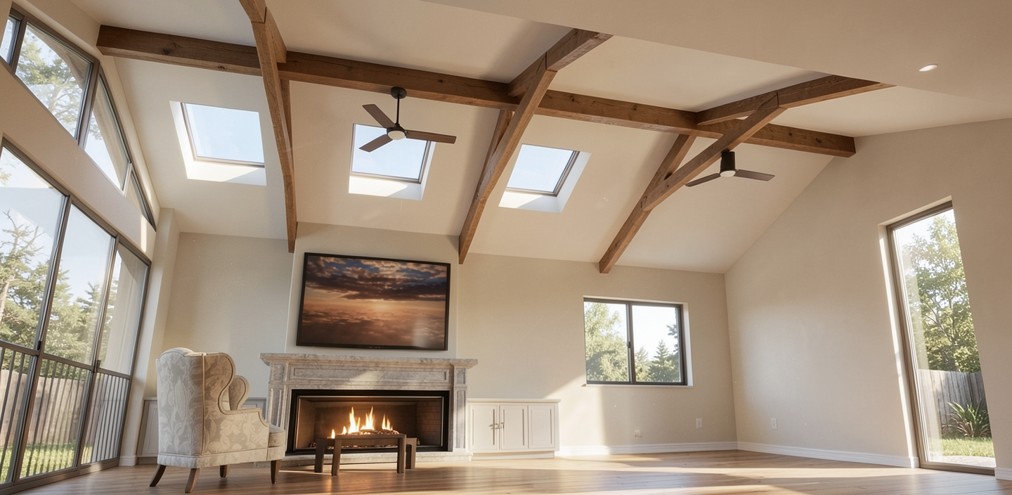 the cabinets are a maple wood the countertops are a grey granite the floor in the kitchen is an off white and taupe bronze checker tile floor the hardware is bronze the backsplash is a navy hexagon tile the outside environment is a small back yard with a tree the front part of the floor is medium honey hardwood add brightness in the front of the room like there is a window where you are standing