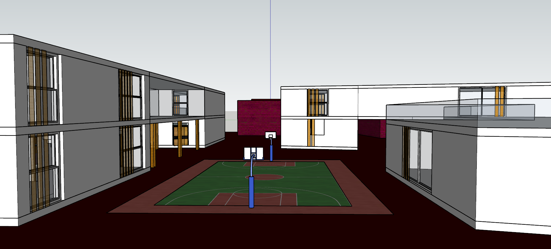 modern exterior shot render during sunset with a basketball court and grey beige concrete walls and grass architecture