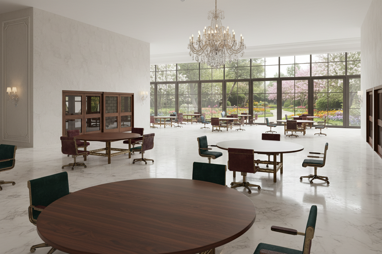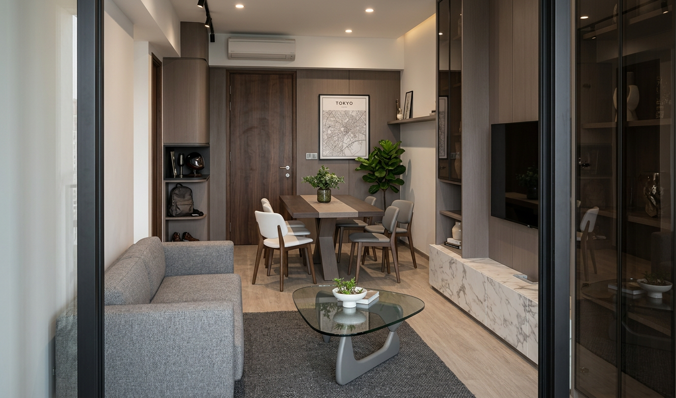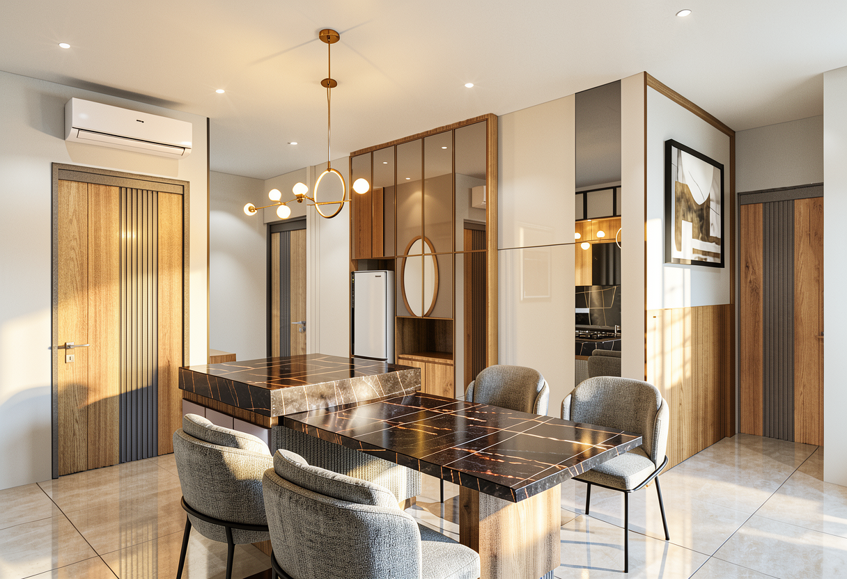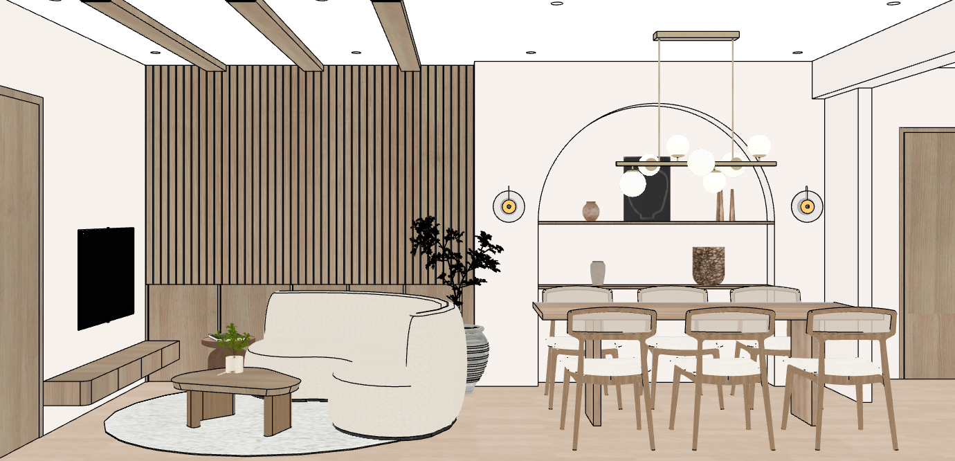 create a cozy interior living dining space with a japandi and wabi sabbi aesthetic feature a cream colored curvy sofa set against a wood paneled wall in warm oak tones position a light wooden coffee table on a soft white round rug include a sleek flat screen tv on the wall adorn the main wall with a large potted green plant the dining area features a wooden table surrounded by chairs with light beige cushions above the table hang modern pendant lights with globe shaped bulbs add small decorative vases on a white wall shelf the atmosphere is calm and inviting with a warm neutral color palette put led lights inside the arch wall