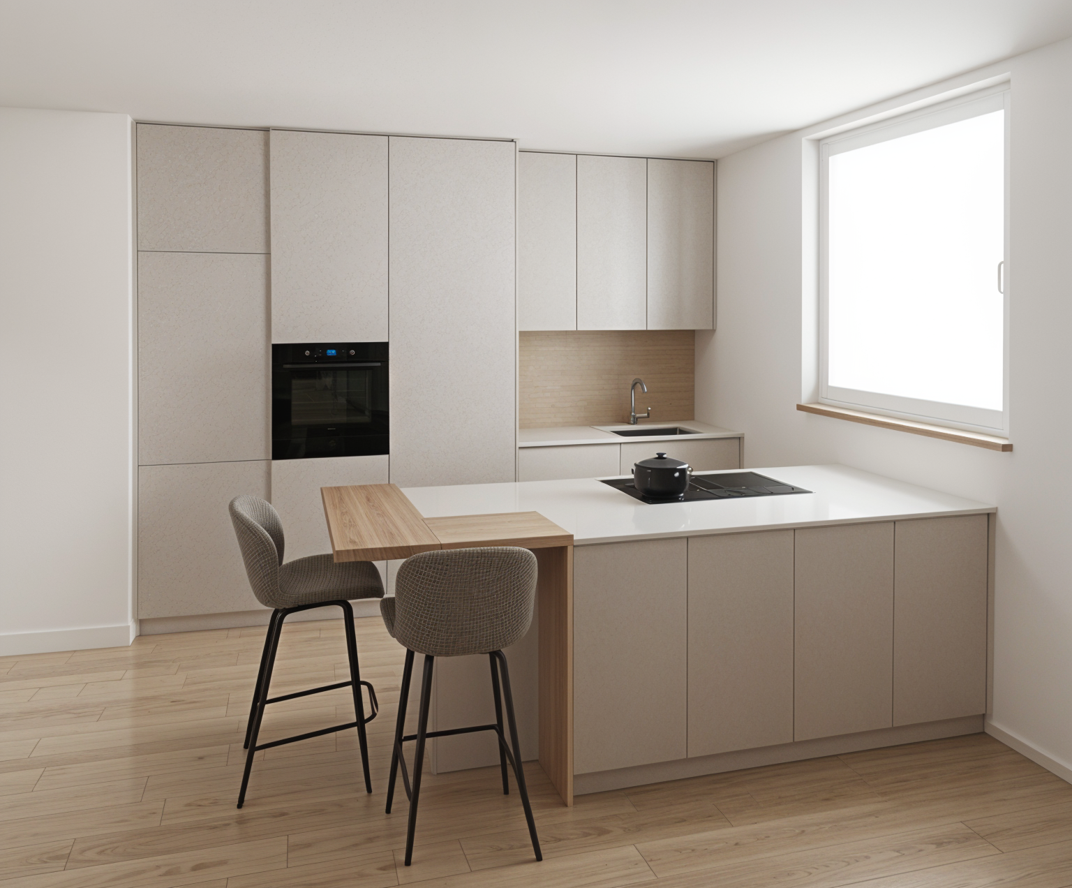 flawless dull oak flooring roteted 90 degreed wall and ceiling white painted cabinets fundermax 0071 fresko ap countertop dekton marina silvercoast without handls background over the sink in oak oven in black boraxbo egde on the counter in oak cookingpanel bora classic with gas cabinets under the counter fundermax 0071 fresko whitout handlsthe visible outer surfaces of that structural box in fundermax 0071 fresko cabinets over the sink in fundermax 0071 fresko